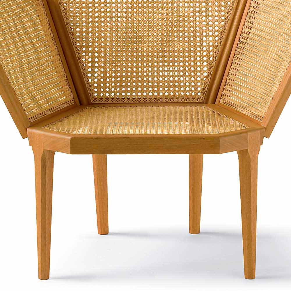 Canned armchair composed of pentagons. A classic of the furniture, the wooden chair with seat in Vienna straw typical of the early twentieth century, is revisited in a futuristic look where traditional processing techniques are taken with fidelity and mastery, but the curved and sweet shapes of the original model leave space with simplified lines and crystallized forms that multiply in space.