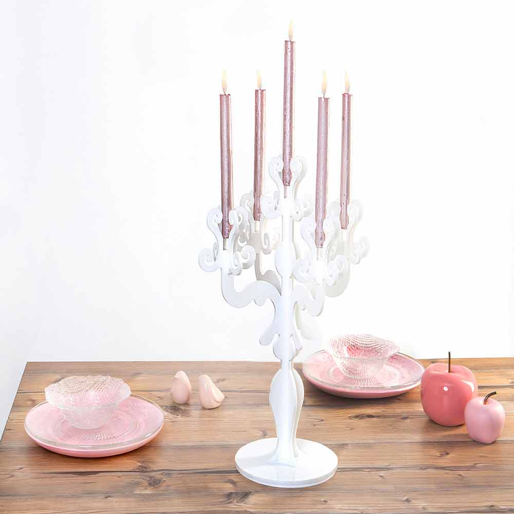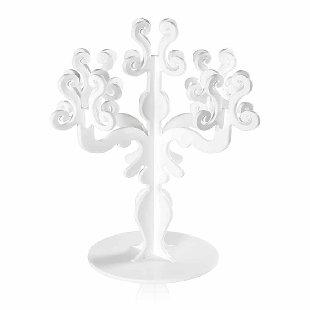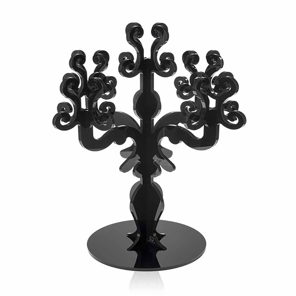 Medium candle holder with 5 arms in plexiglass: Arbus The Arbus candle holder is elegant and with a renaissance taste adapted to our time: 5 arms in transparent plexiglass PMMA, with laser cut shapes recalling the precious ornaments of the renaissance candle holders in rock crystal. The physical-technical features of the plexiglass (shock-proof, nondeformable, unalterable, thermal-insulating) make the candle holder suitable both to the indoor and outdoor spaces. Its brightness and brilliance are maintained unvaried and unaltered over time. The utilized PMMA plexiglass from virgin polymer is nontoxic, hypoallergenic, odourless and antibacterial. 100% recyclable. Thought, designed and made in Italy with italian materials. Its measurements are: L 36 x P 36 x H 50 cm. Available in the following colours: black, white, transparent smoky-grey and transparent.