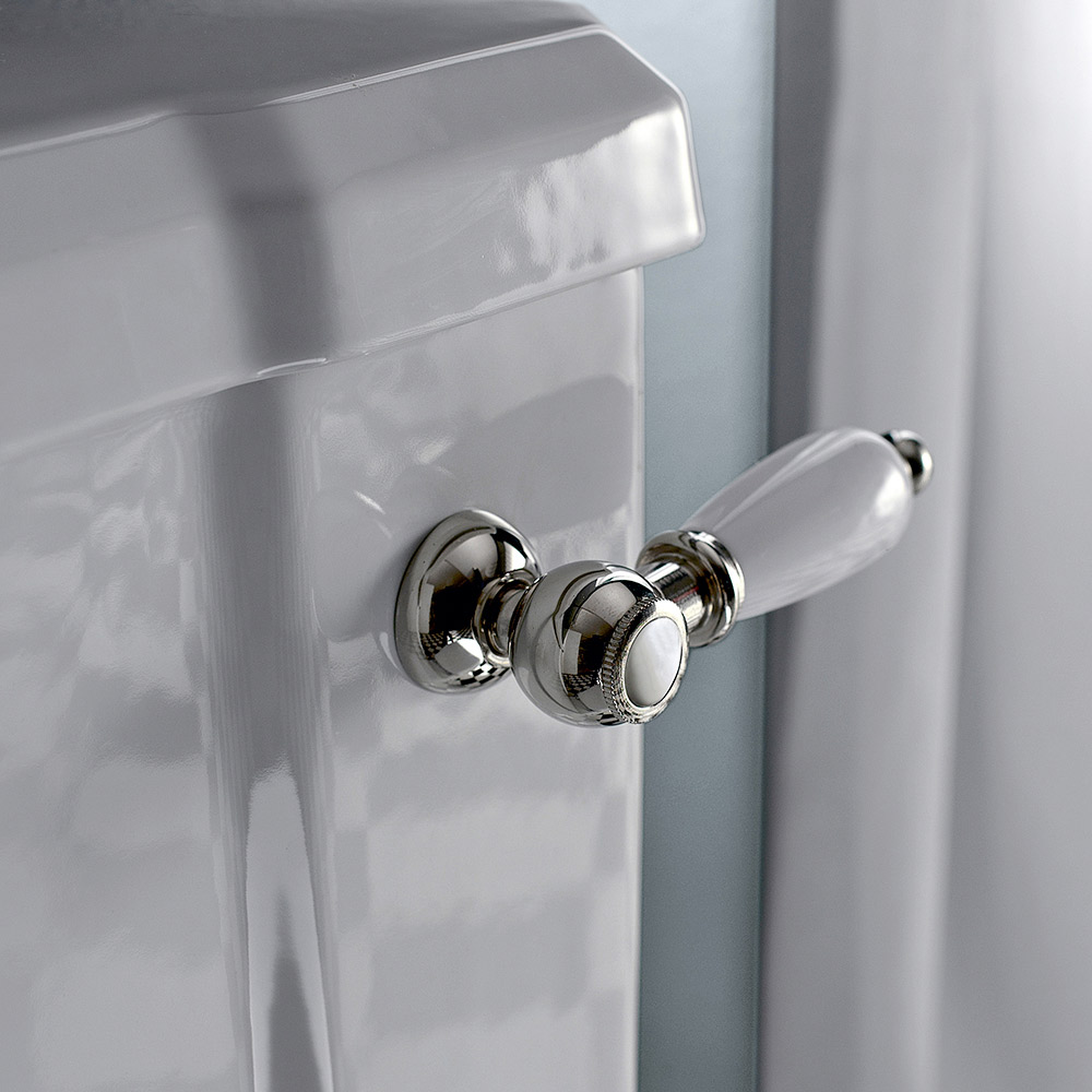 Marwa is a stately monobloc vase with dripping rim and floor drain . Modernity and tradition merge with the use of the white seat with chrome hinges and the monobloc box with hole for the drain battery with front lever in white ceramic and nickel finish.