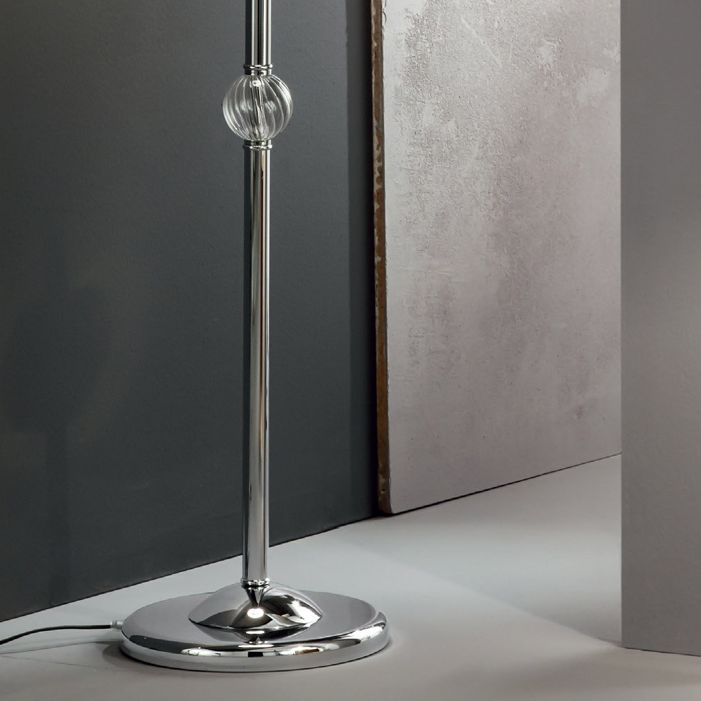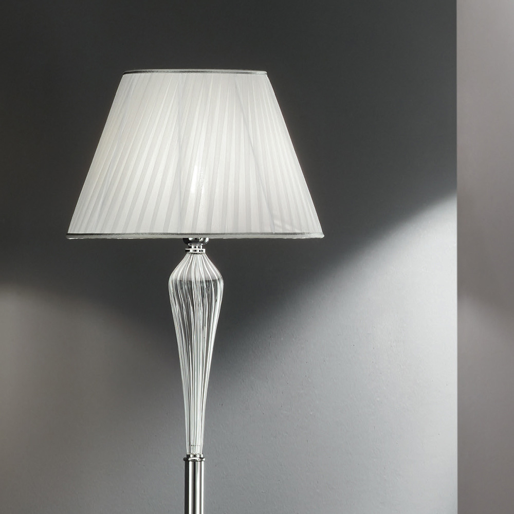 The peculiar characteristic is given by the precious motifs produced in glass handmade in Italy with a "rigaton" effect which allows a glimpse of the metal core and which supports the lampshade in white pleated effect fabric .