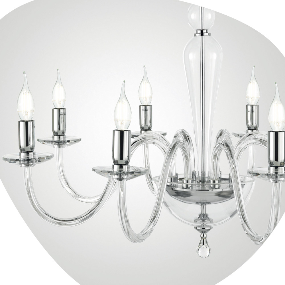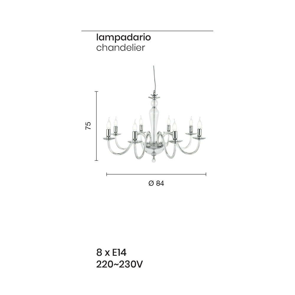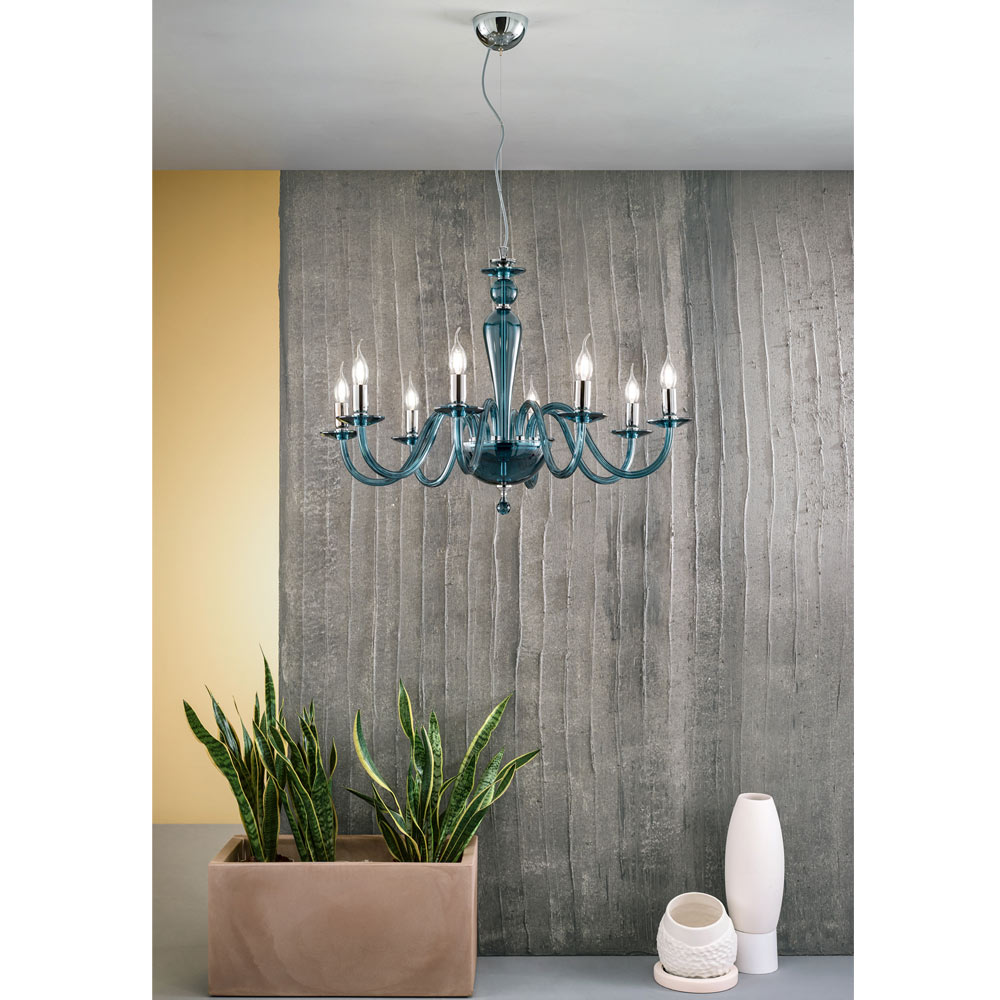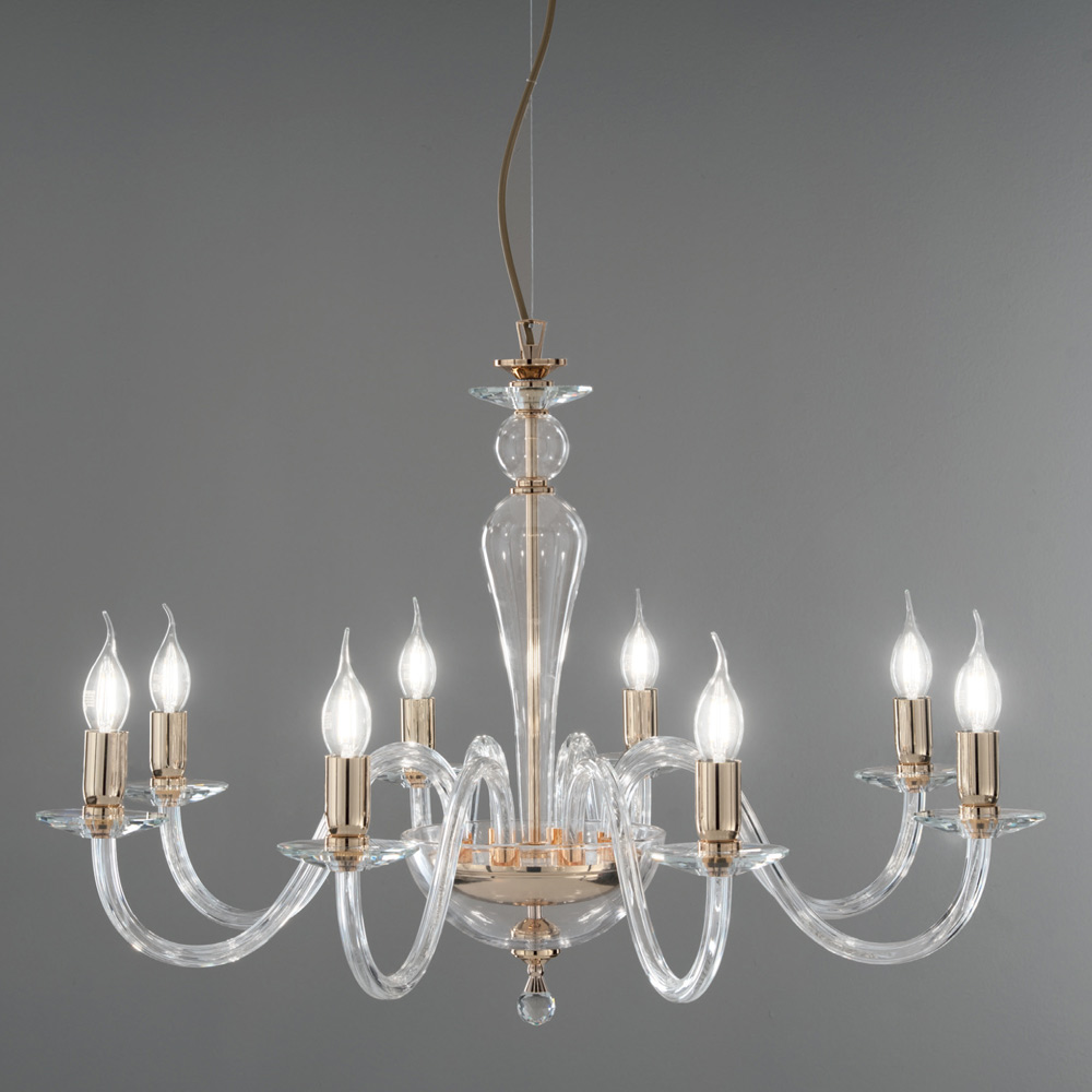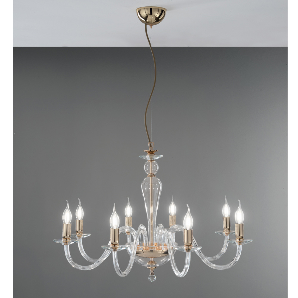 This classic style pendant chandelier is made up of 8 arched arms made of glass handcrafted in Italy which support the saucers hosting the light sources.