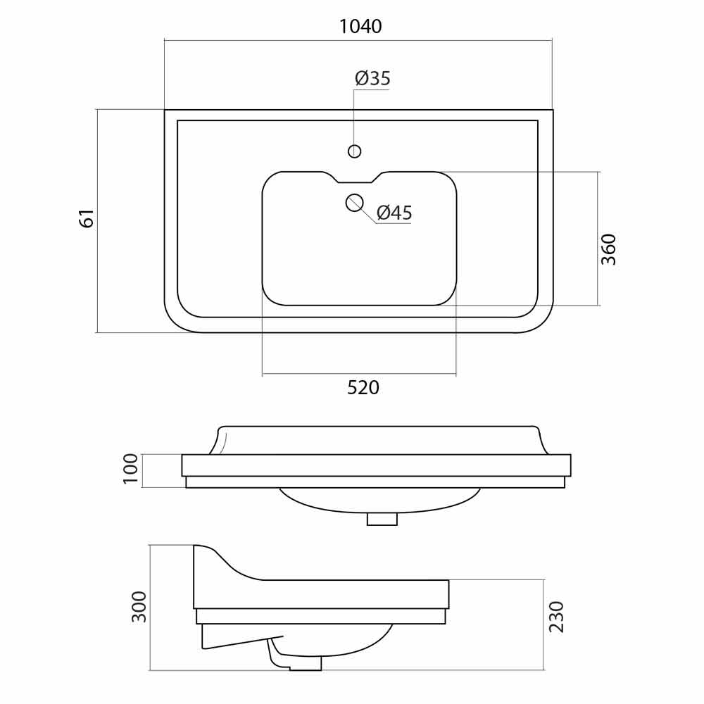 Countertop console washbasin with single basin made entirely of white ceramic.