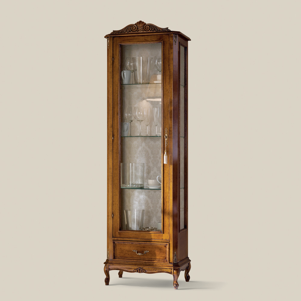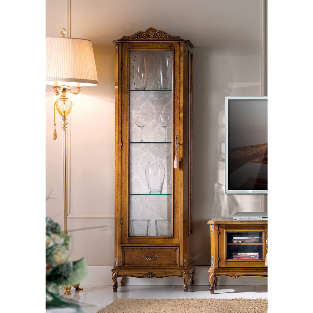Classic style living room display cabinet made of fine Bassano walnut finish wood with one door and one drawer. Elegant and timeless, this classic style display case is ideal for creating impressive environments. Completely made in Italy by skilled master craftsmen , masters of art who finish each piece of furniture with wisdom and taste for elegance. Production is carried out using fine materials , first of all wood, and carrying out the work by hand with the utmost care and professionalism that distinguishes Made in Italy products.