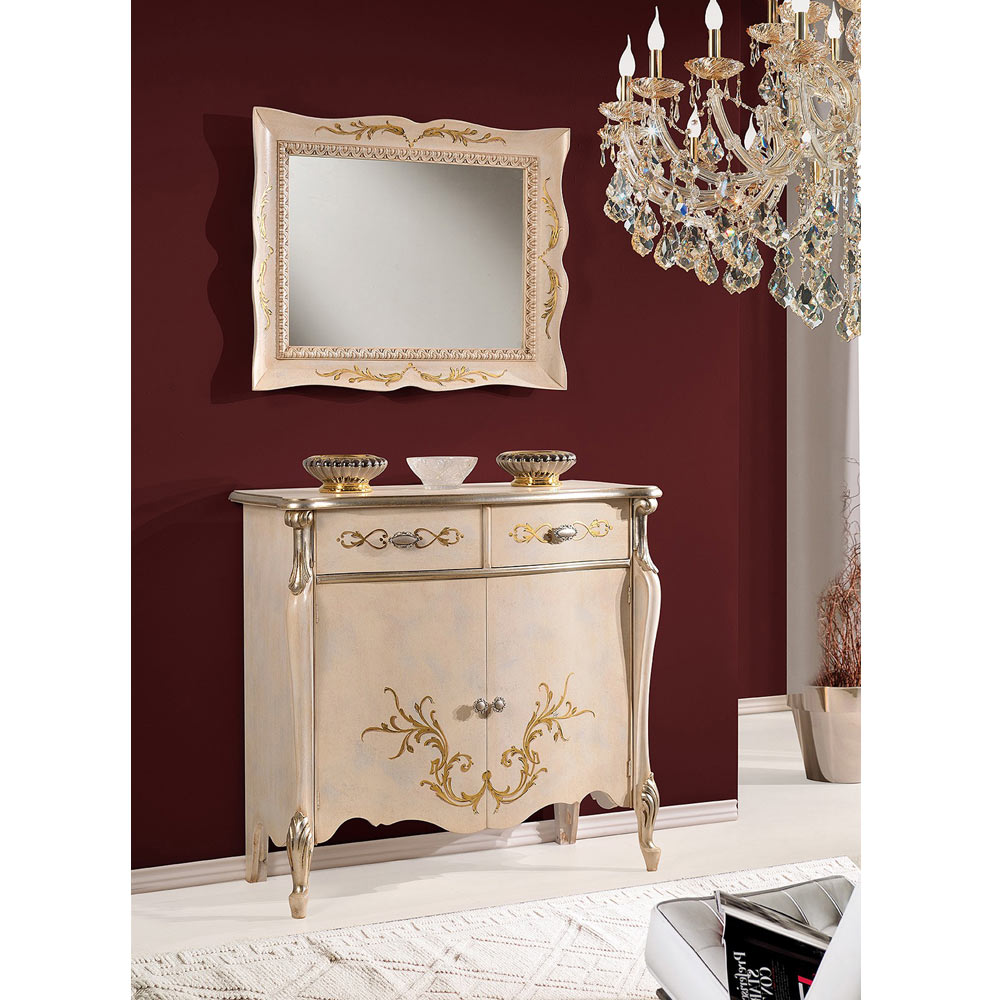 Living room sideboard with a classic and elegant style complete with 2 doors and 2 practical drawers, available in Bassano walnut and antique gold or antique white finish with inlays. A unique and refined complement, completely