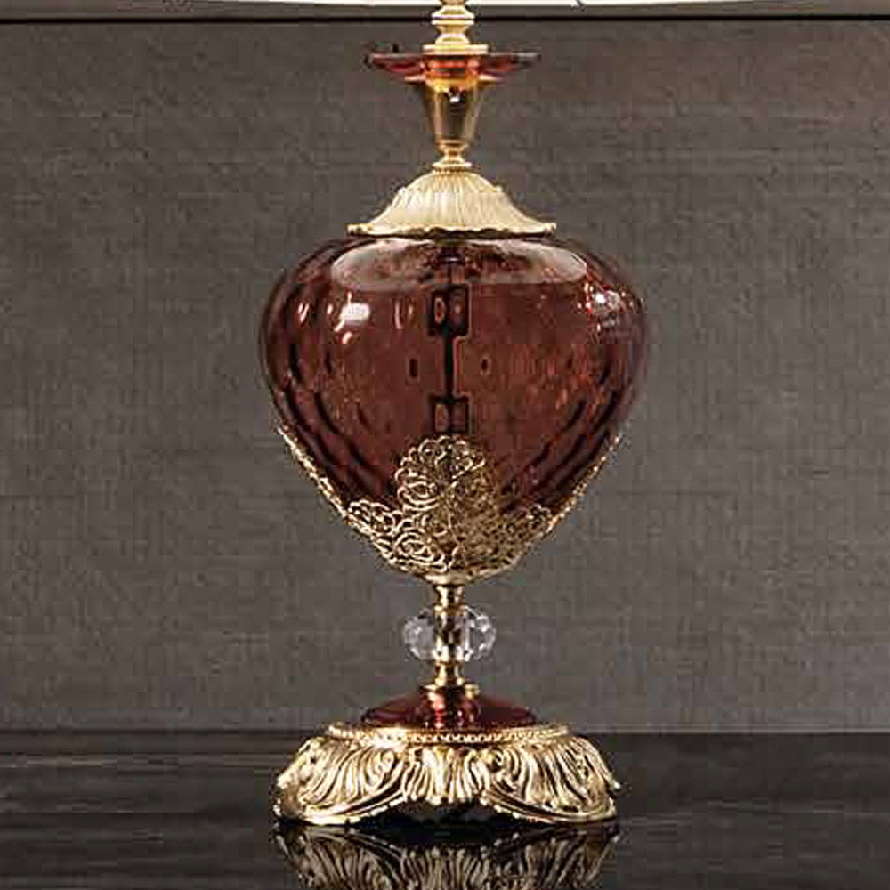 - Burgundy glass body - transparent glass details - satin gold metal and cream lampshade.