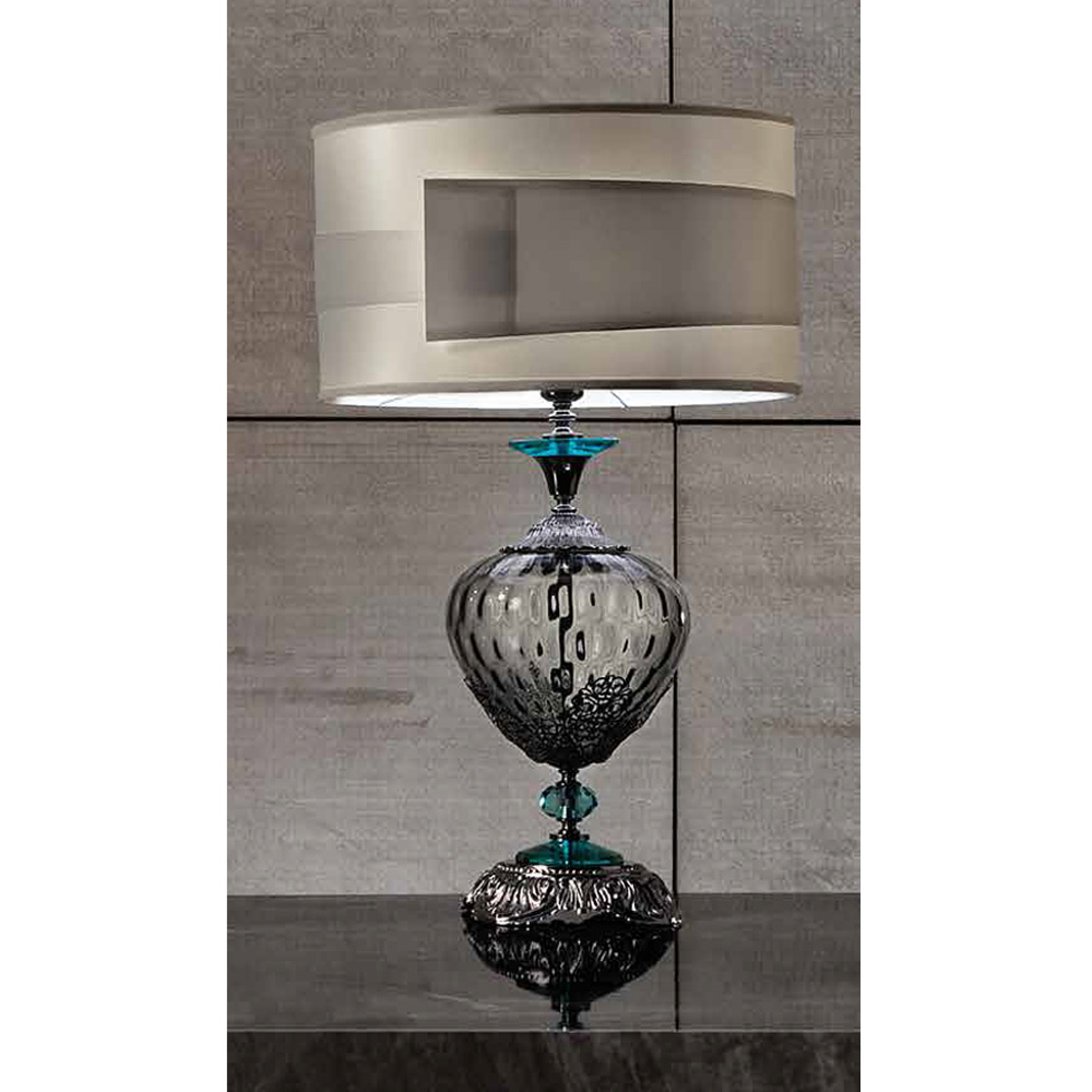 - Smoked glass body - turquoise glass details - burnished metal and light dove gray lampshade;