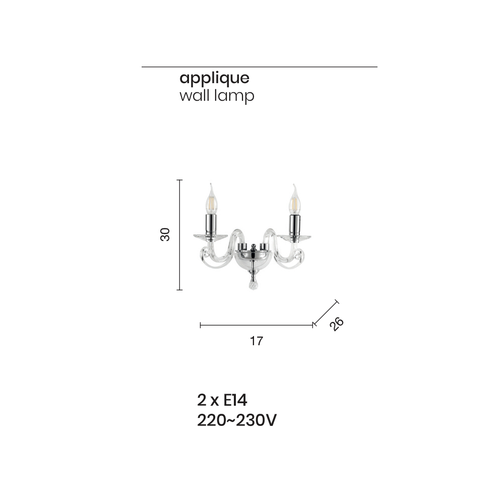 Made of hand-crafted glass and optical crystal with high quality materials and particular attention to detail , the wall light will become the protagonist of the environment in which it will be placed, embellished with the round optical crystal pendant and chromed metal details.