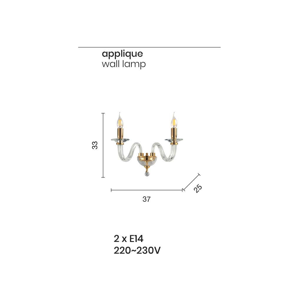 2-light wall lamp in handmade glass and gold metal, classic luxury made in Italy.