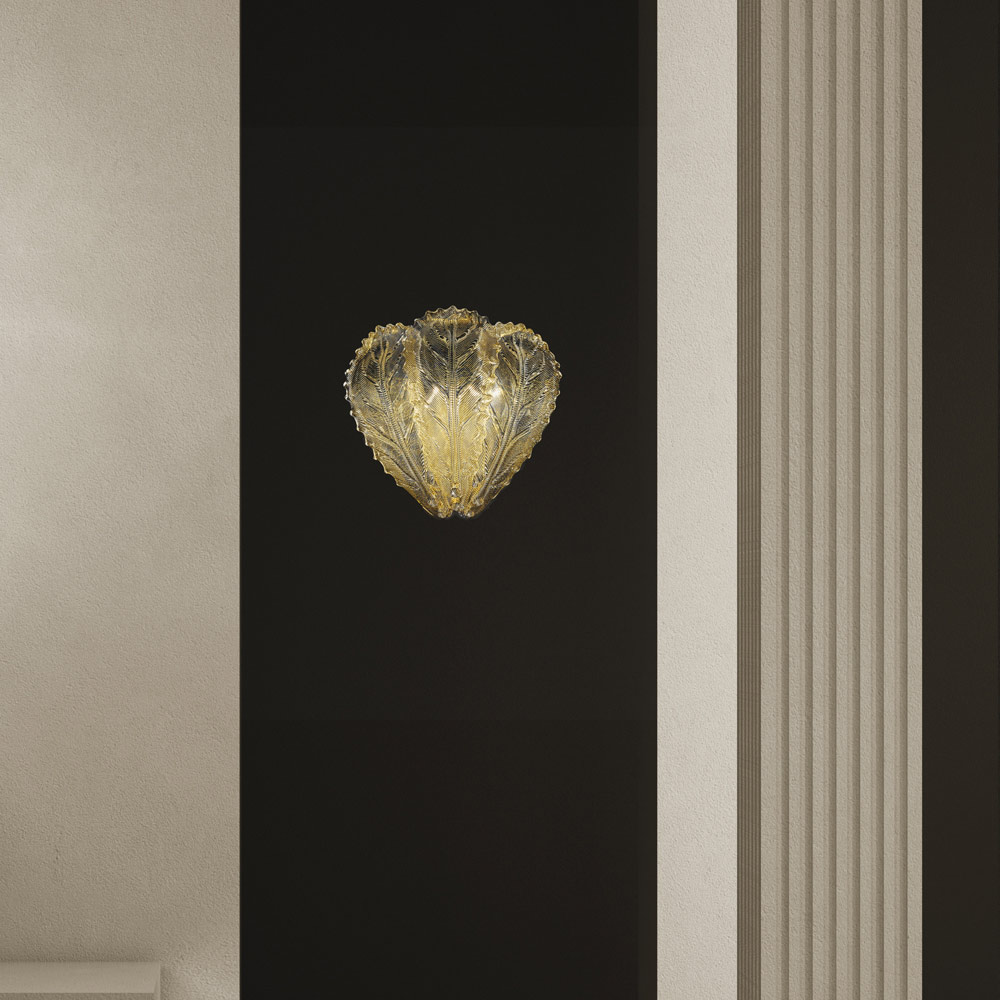 2-light wall lamp made of hand-crafted Venice glass 24K gold finish with shiny golden metal details. From the perfect combination of an elegant naturalistic inspiration and a strong functional side, a furnishing solution is born that characterizes any environment thanks to its iconic presence but at the same time light and vibrant. To underline its uniqueness is the special hot working which allows to imprint the veins of the leaves on the surface of the glass for an exclusive and classy result . Realism is tinged with elegant tones that are intensified thanks to the application of tone-on-tone glass grit, bringing to life a real work of art.