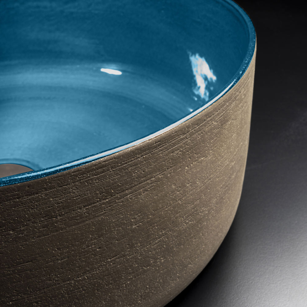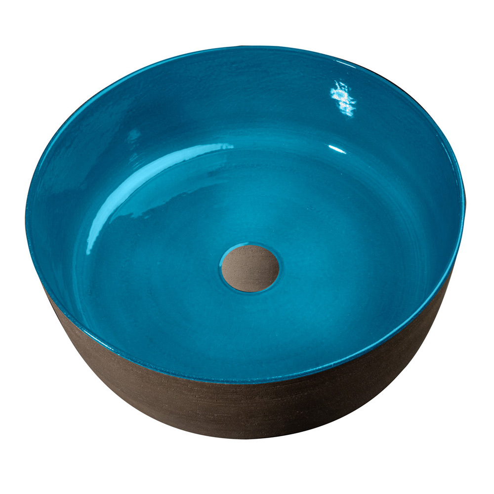 Round countertop washbasin entirely made in Italy in refractory clay , turned by hand with third fire cooking. Its aesthetic is characterized by the perfect combination of the natural waxed and waterproofed exterior with a more rustic style and the glossy and vitrified blue finish interior with a more elegant and refined taste. Each element of the washbasin is handcrafted to give life to an exclusive furnishing solution, of high value and of unparalleled quality.