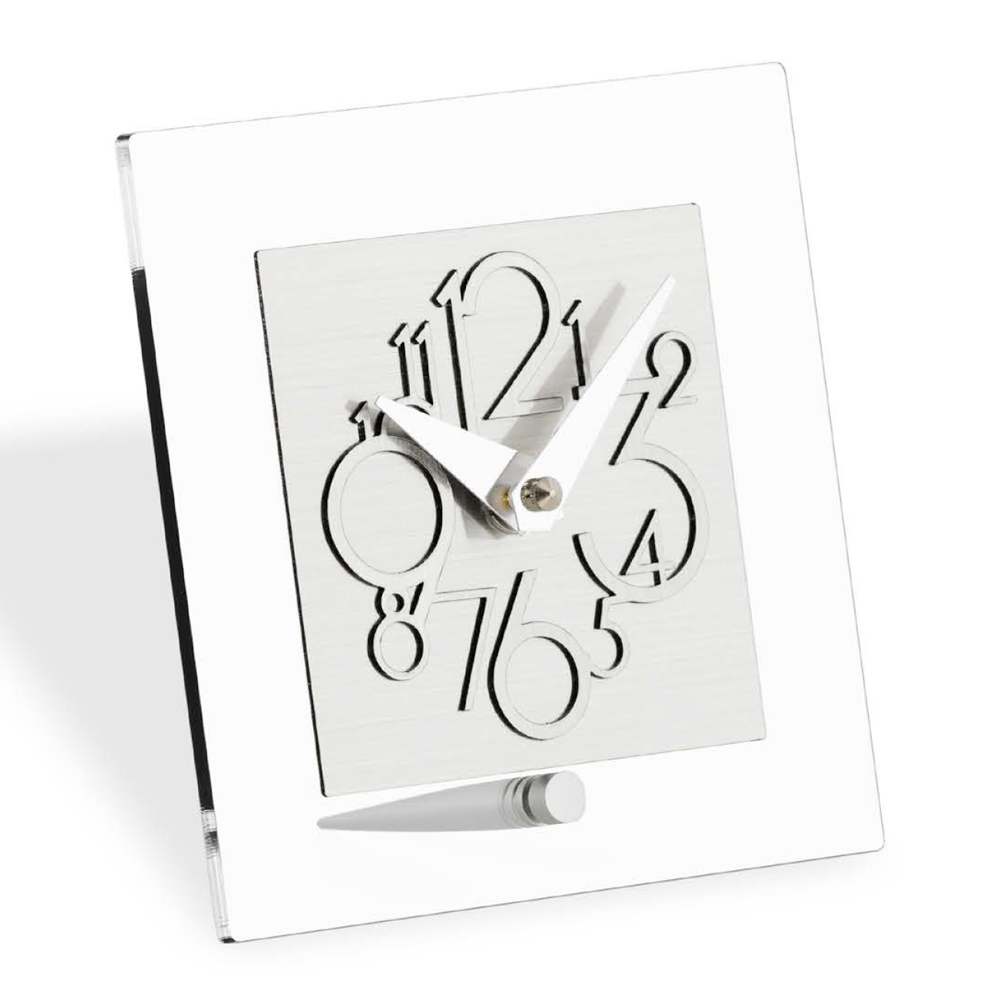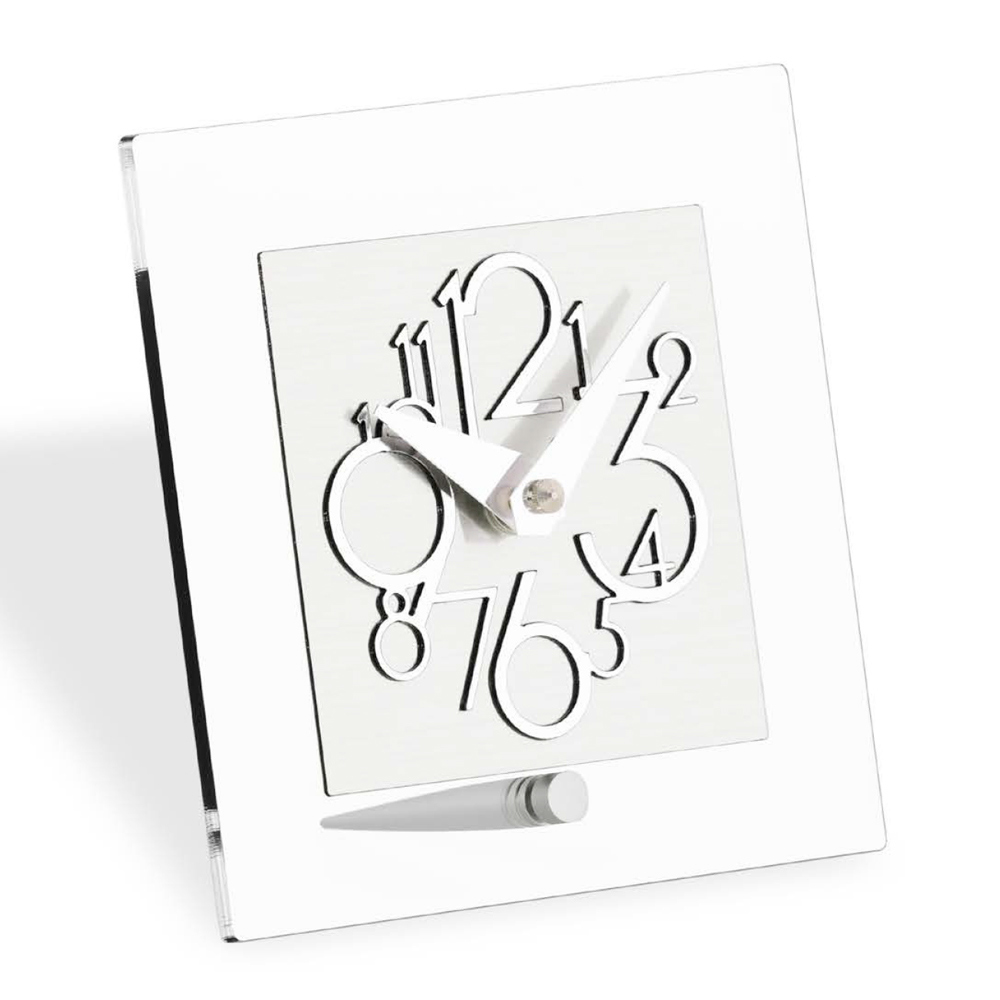 This table clock is an exemplar of innovative design and sophisticated style . With its numbers appearing to dance across the dial, it captures a sensation of movement and liveliness .