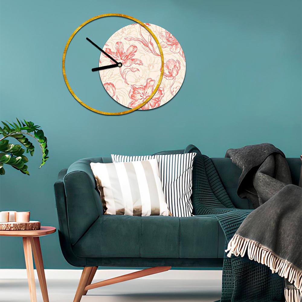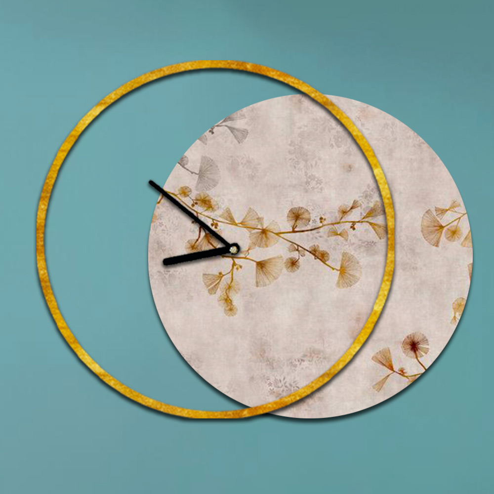 - gold leaf clock and print with branches and flowers in shades of pink/ochre