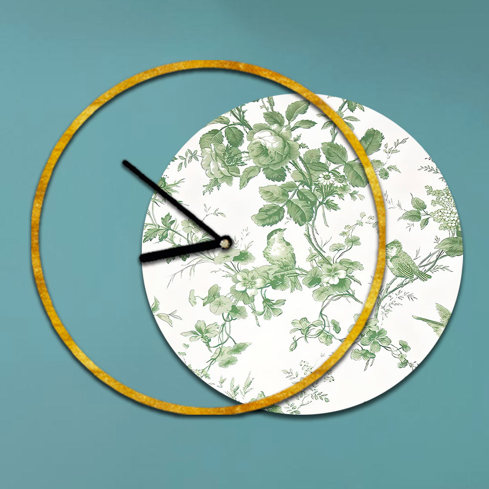 - gold leaf clock and print with branches and birds in shades of green