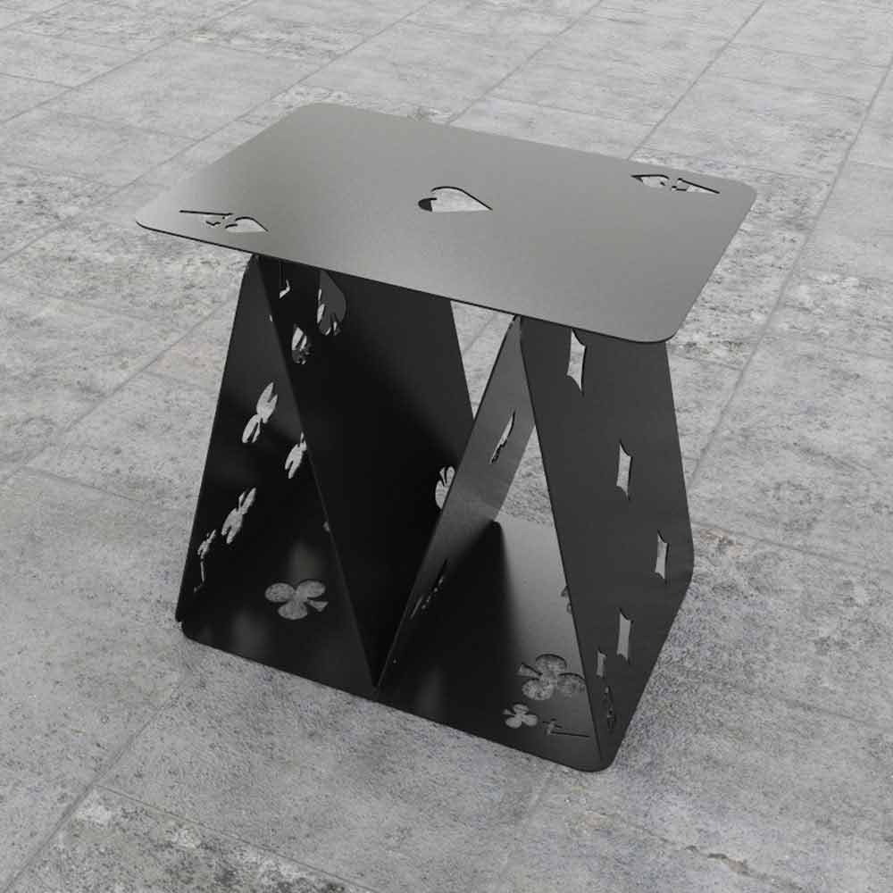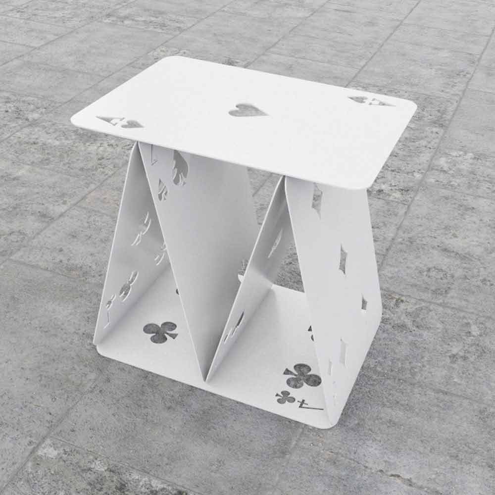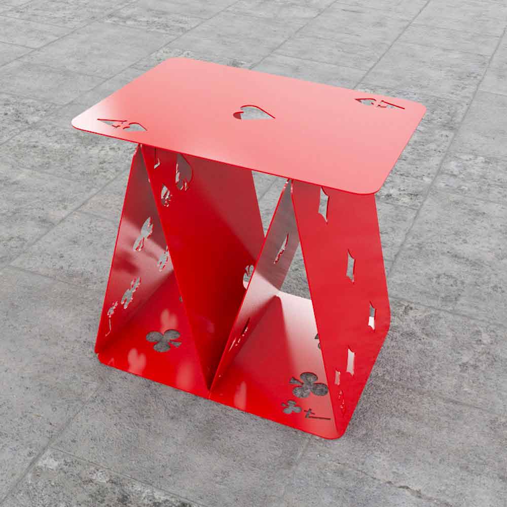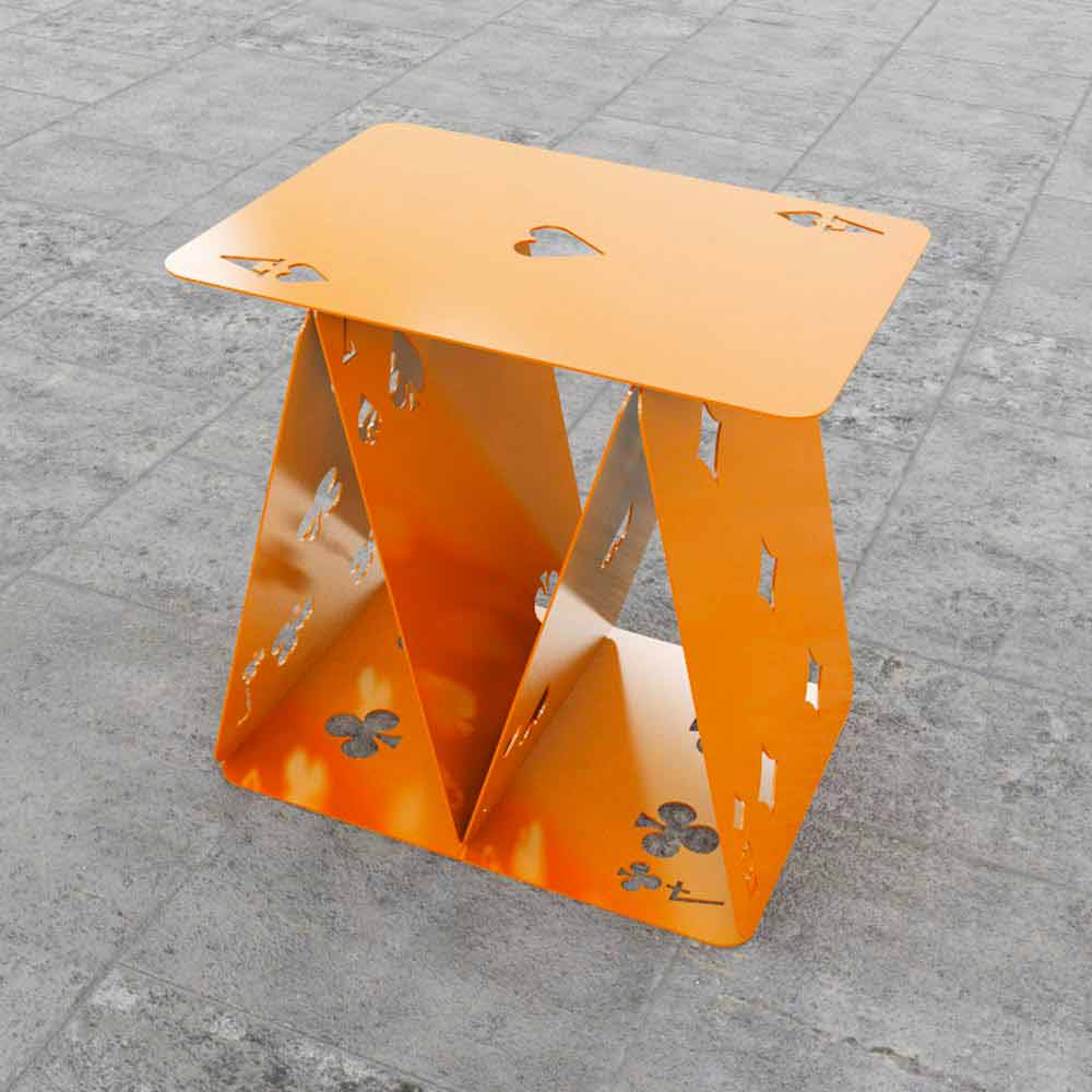 Six metal colorful cards are arranged like the house of cards game, becoming a nice stool.