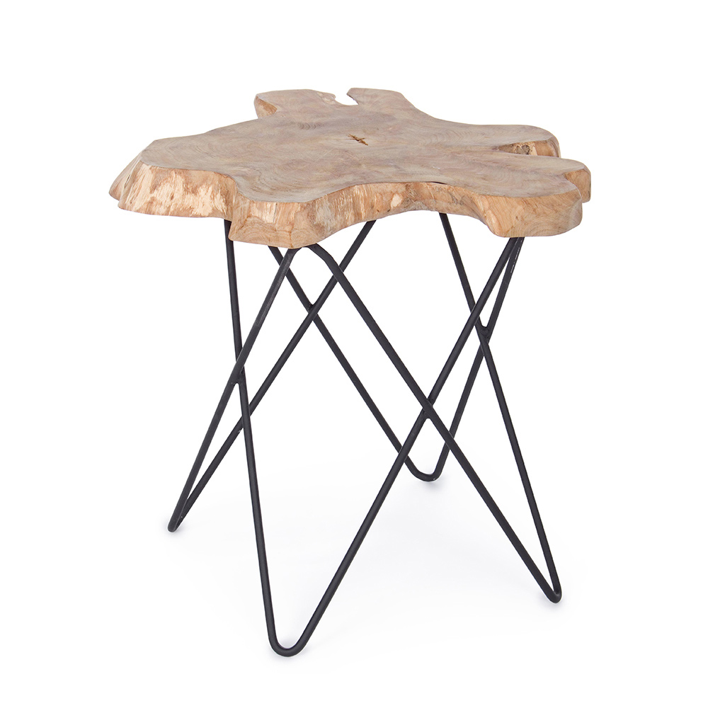 This living room coffee table is made with a floor made of teak roots with a natural finish And legs in epoxy powder coated steel.