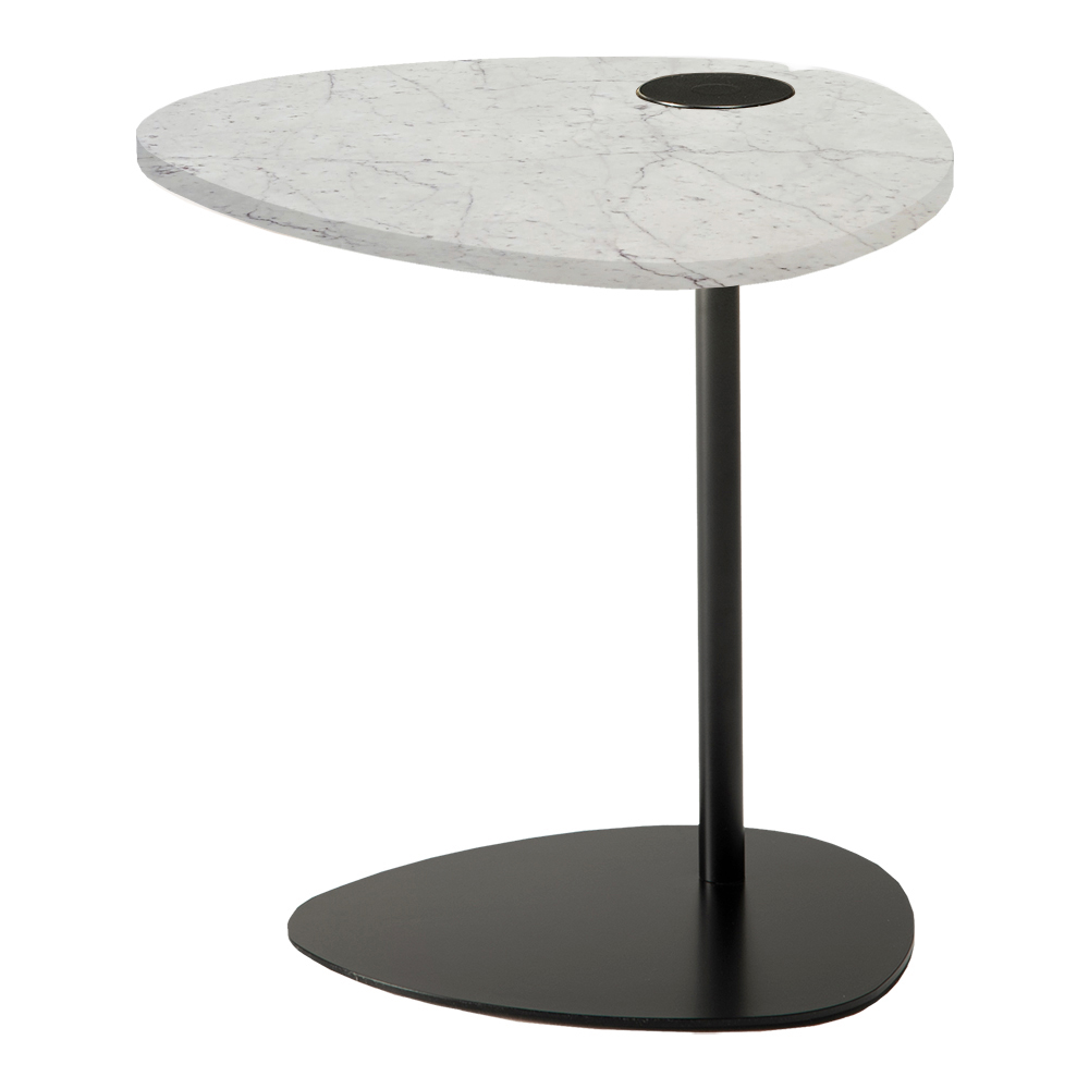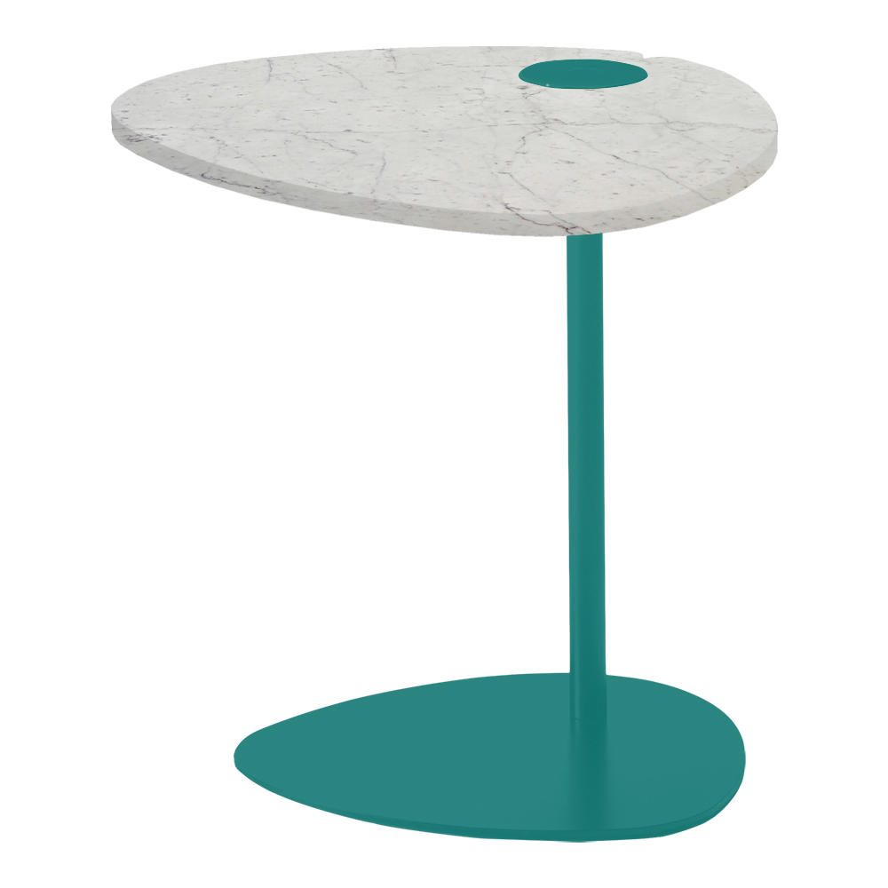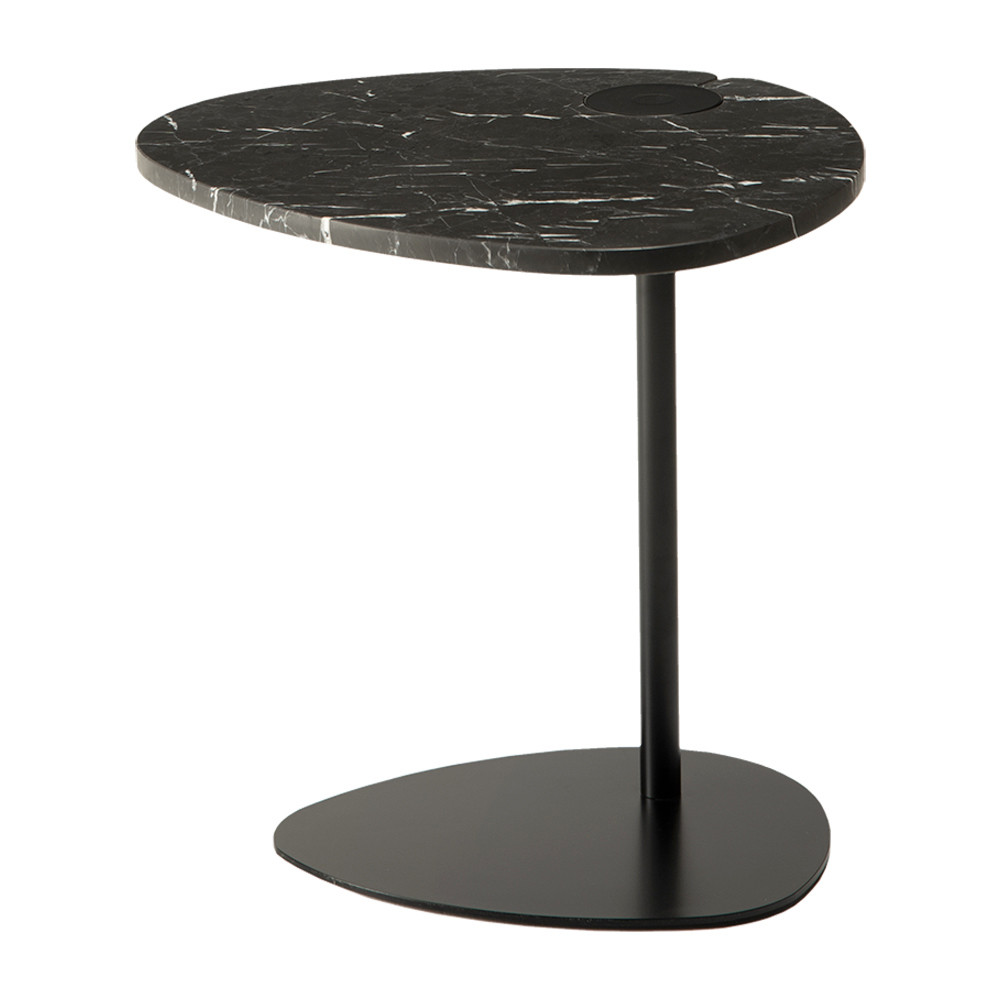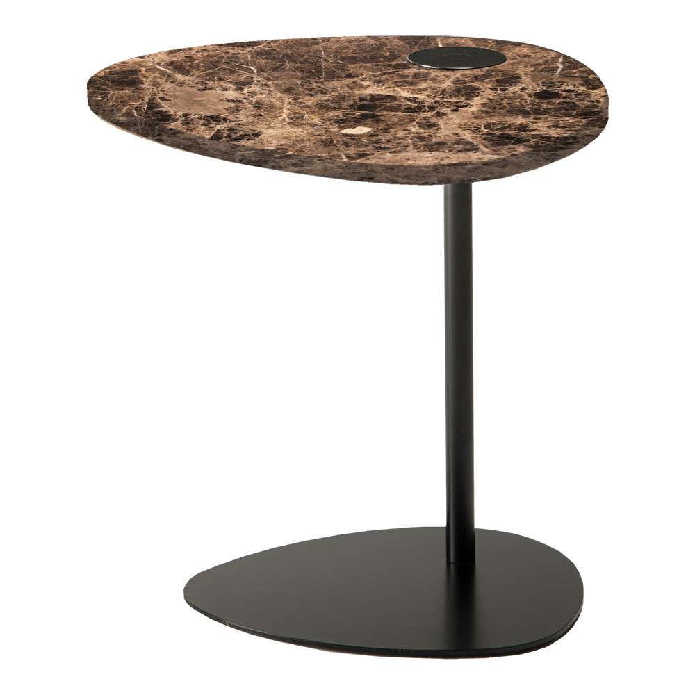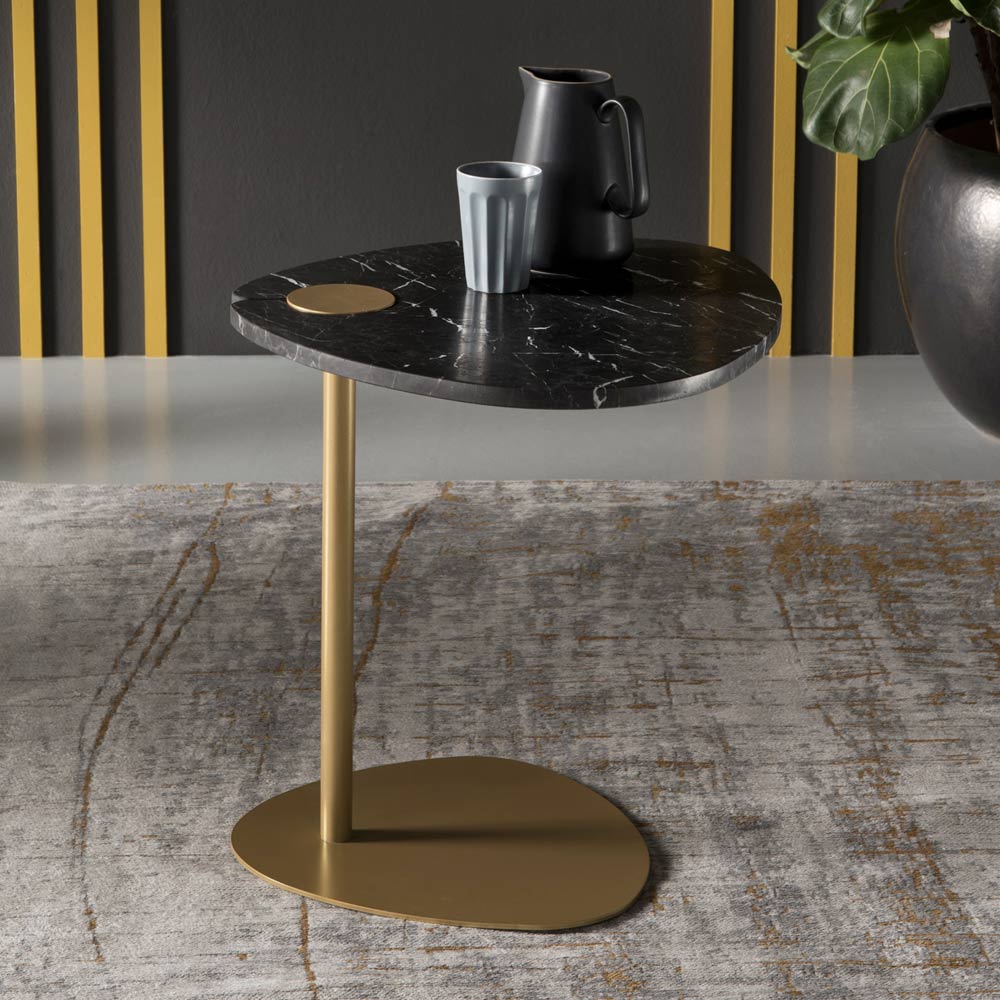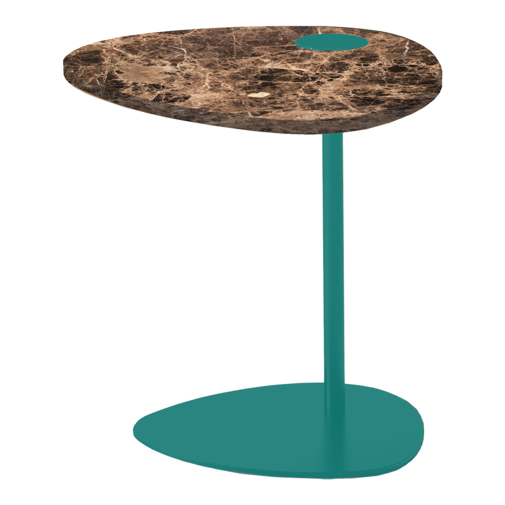 This sofa side table for the living room is inspired by the irregular and natural shapes of the pebbles smoothed by the water. The particular and interesting lines differ to enhance the room and give it a touch of refinement. Its original and elegant design is made up of different materials but which communicate with each other in a harmonious lightness: the thin but resistant metal of the structure supports the marble top.