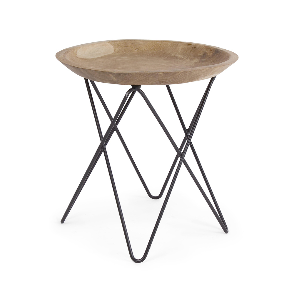 This coffee table is made with a natural finish teak root top and epoxy powder coated steel legs.