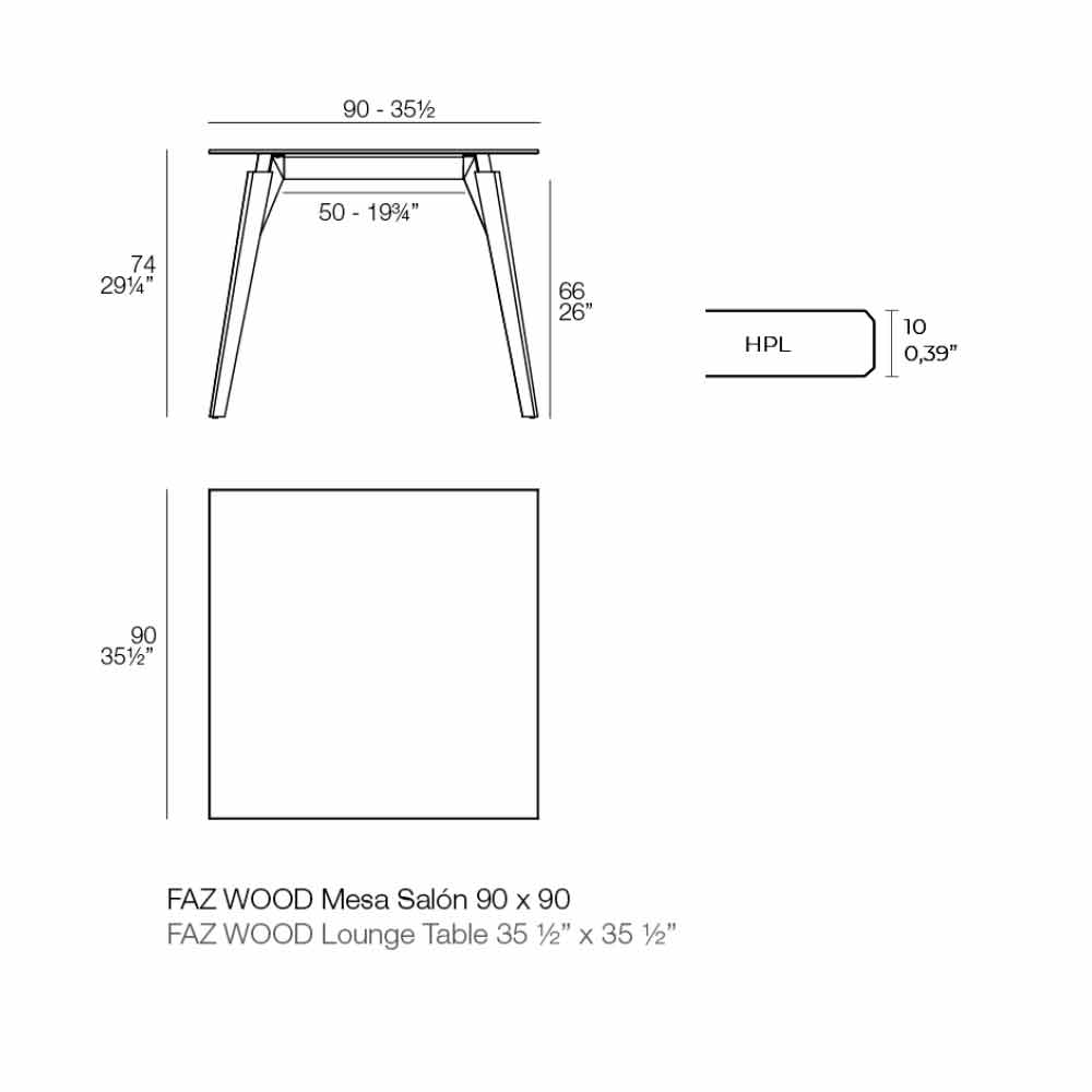 Coffee table with legs in light or dark ash wood and hpl top in various finishes and 2 square sizes.