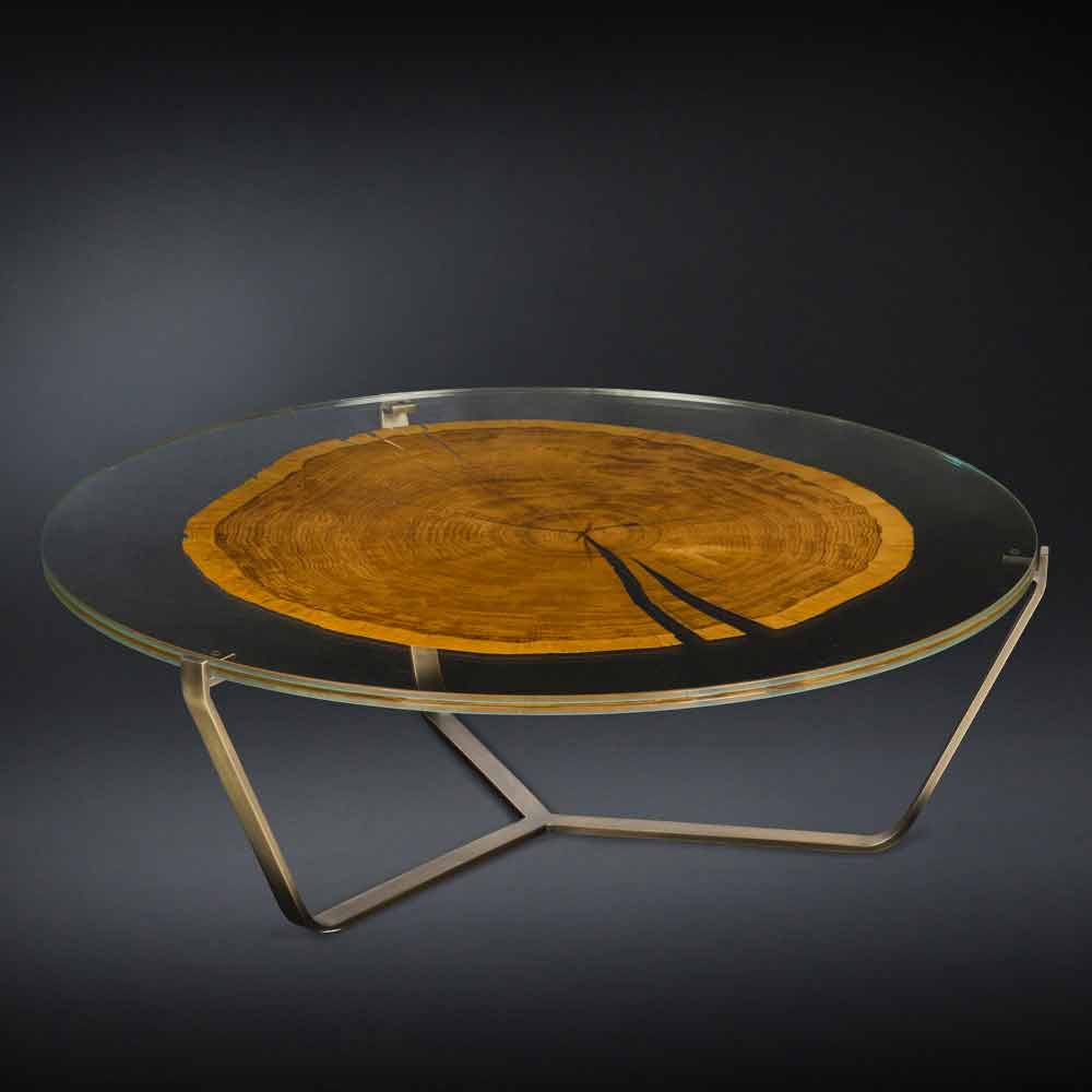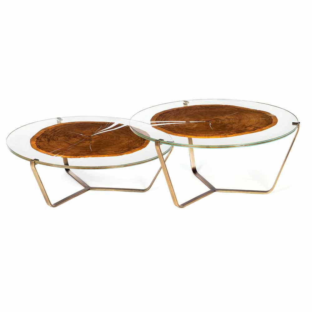 Coffee table made entirely in Italy with a round top in coupled glass (5 + 5 mm) inside which a section of end- cut wood is inserted, all supported by a metal base in burnished brass finish . A perfect combination of elegant and refined elements and modern and avant-garde details to give life to a piece of furniture with a versatile soul and an exclusive design . Ideal for giving personality and class to any living area, this coffee table perfectly matches any stylistic situation, bringing with it a touch of refinement and innovation . Thanks to the 100% Made in Italy processing and the use of quality raw materials, it will at the same time offer extreme functionality, proving to be a product of high value and particularly resistant .