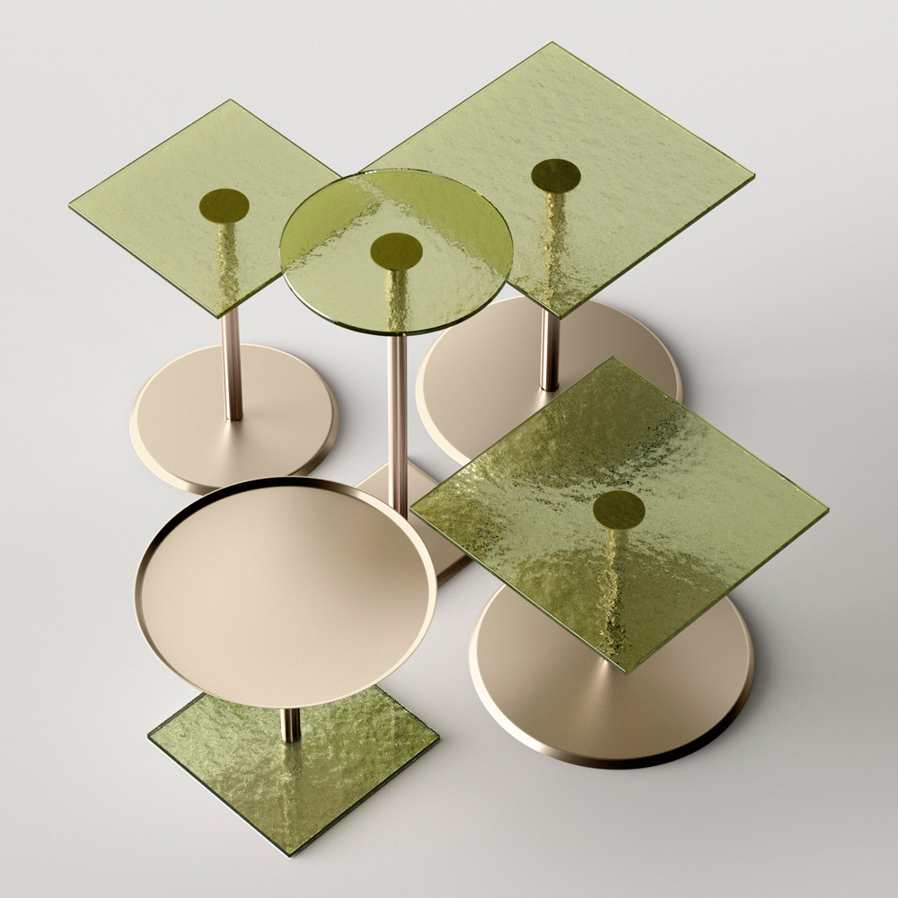 Coffee table made either with a fused glass top and a metal base with a shaped profile or with a metal top with a shaped profile and a fused glass base Made in Italy. The central stem is always in metal with a metallic champagne finish.