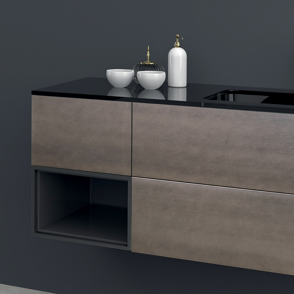 mdf wood in matt antiqued platinum, and the matt basalt gray color of the open shelf.