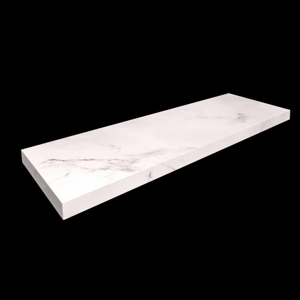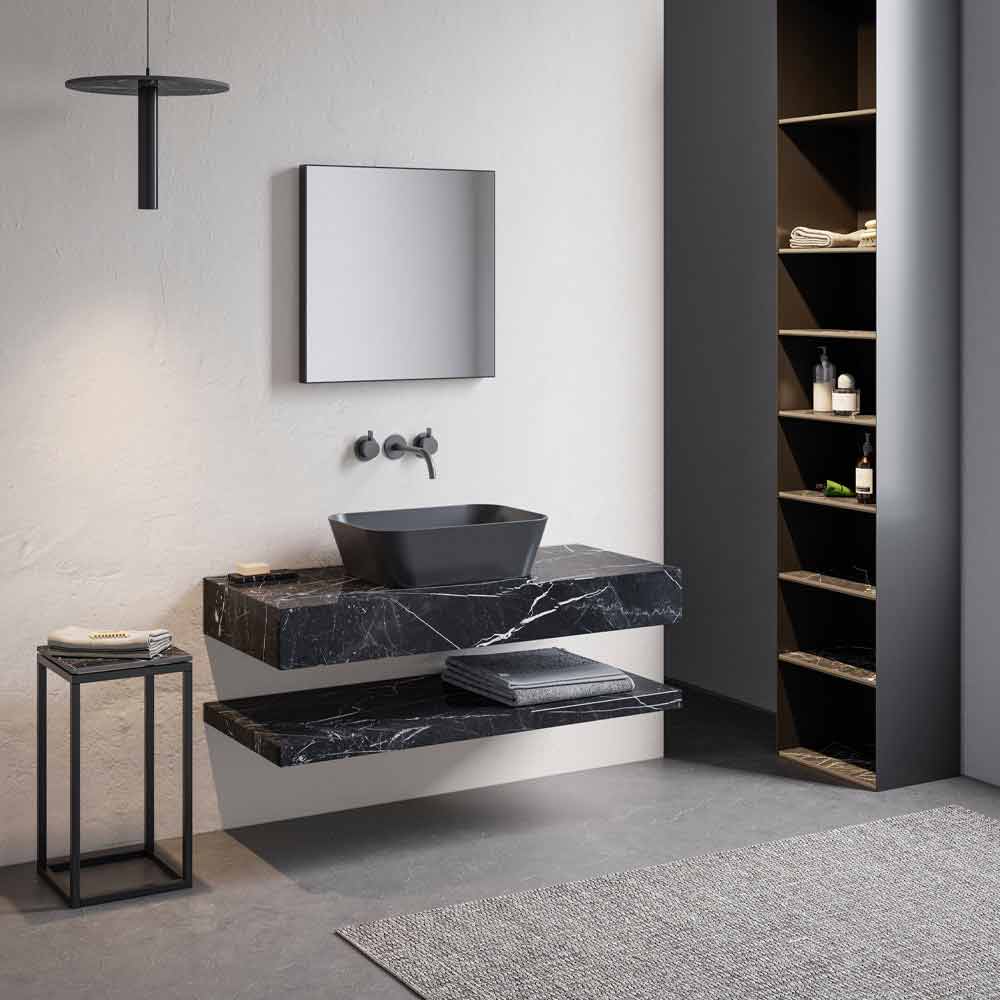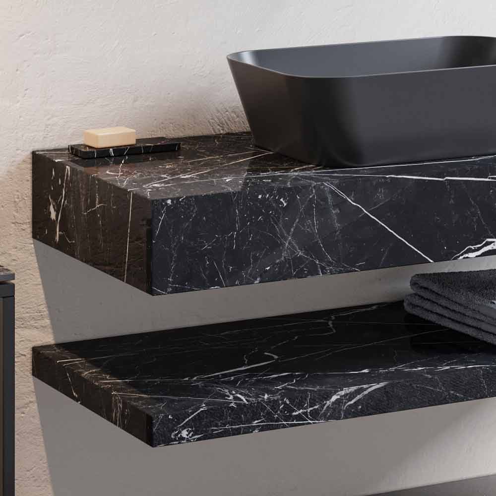 The suspended console and shelf are made of porcelain stoneware available in 4 finishes.