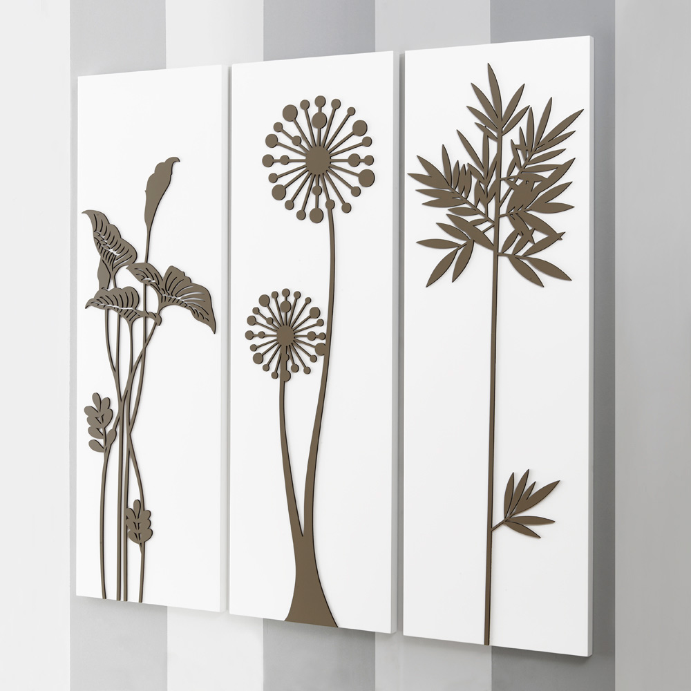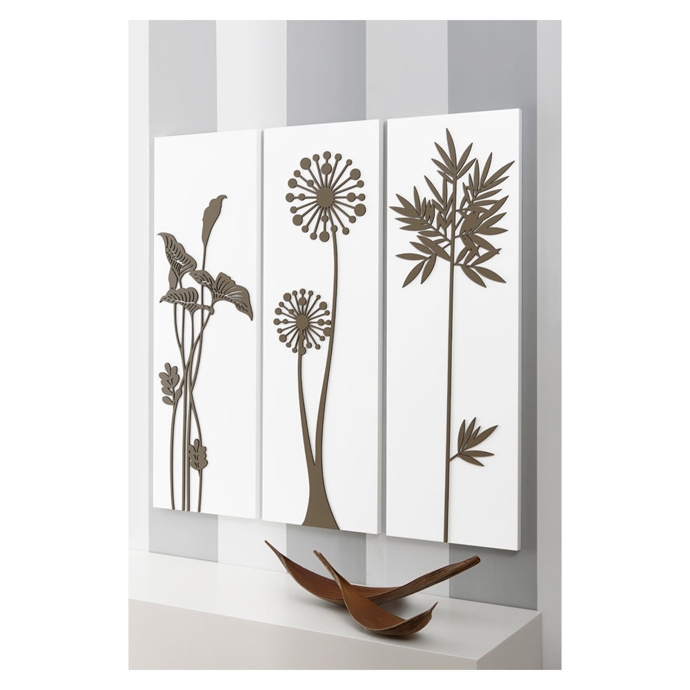 The composition of panels is made using the laser marking technique which creates a bas-relief on the material, creating different gradations of color created on the panel. The panel is made of white lacquered wood with dove gray decoration. It represents stylized flowers and leaves, which create an essential trio of panels.