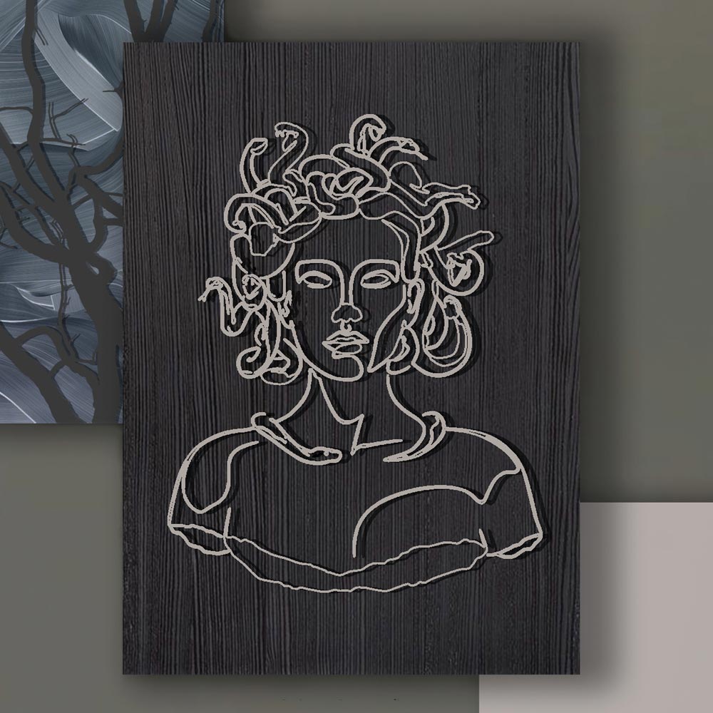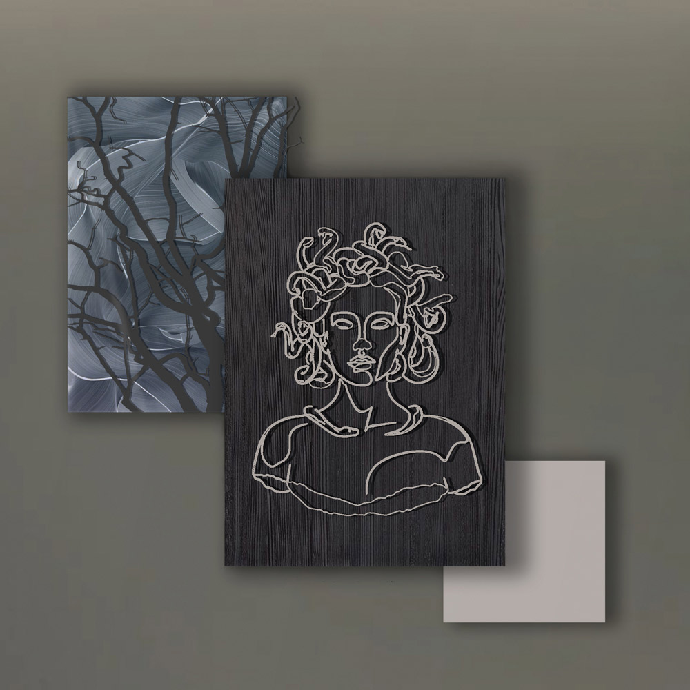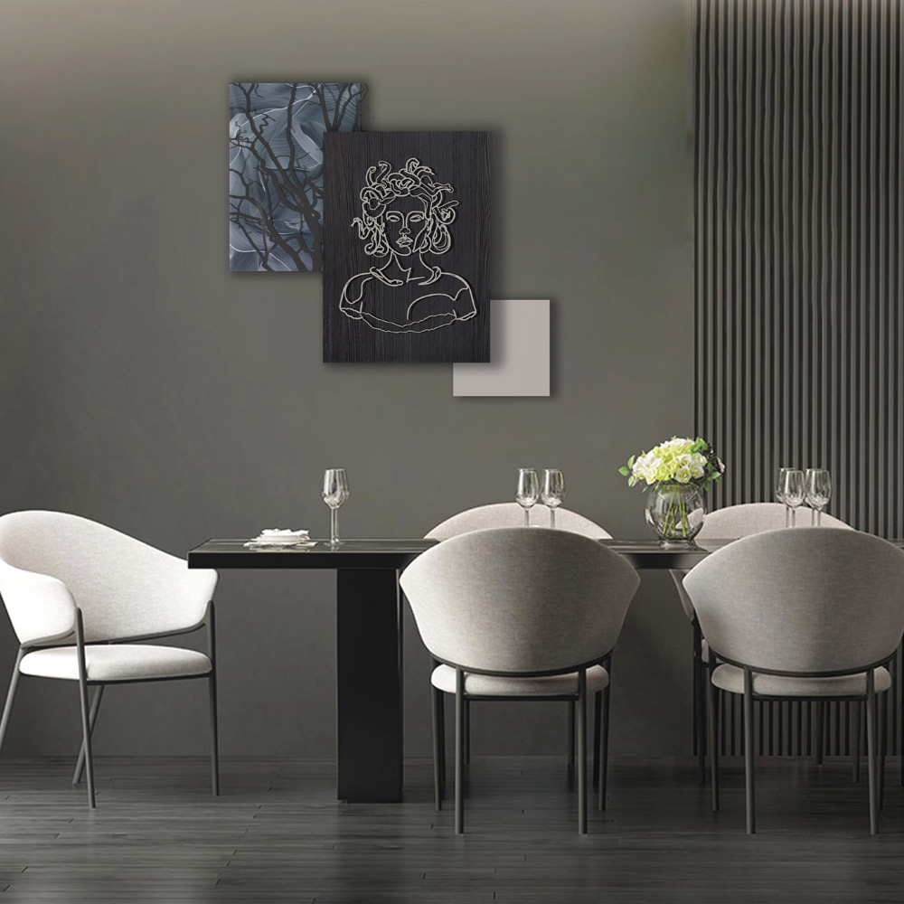 Composition of three printed wooden panels depicting Medusa Made in Italy