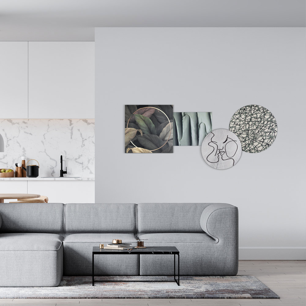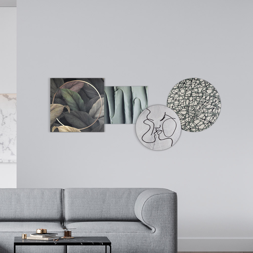 Composition of four panels of different shapes and sizes that combine laser and print decorations . Composed of four printed wooden panels: a square one with leaves, a rectangular one with curved lines, a round one depicting the kiss and a round one with intertwined lines in shades of green and black.
