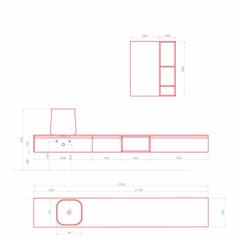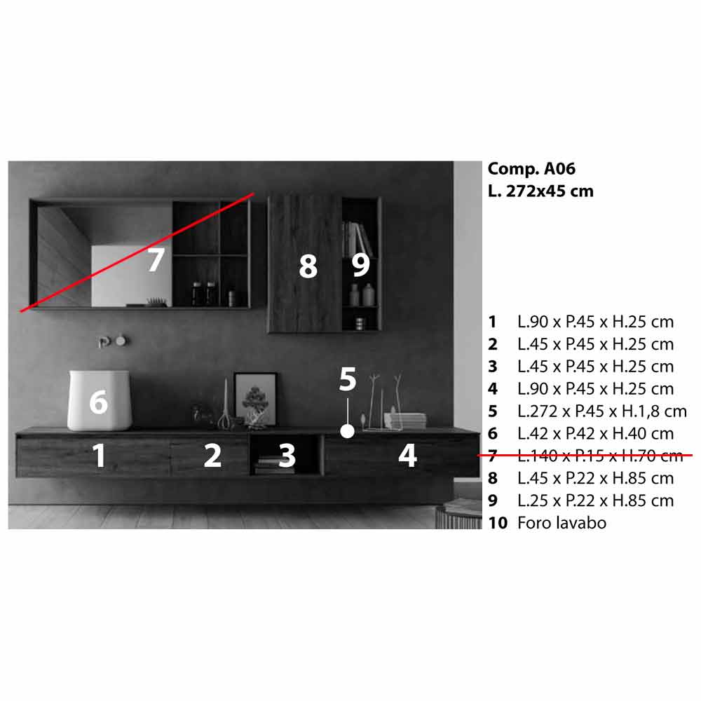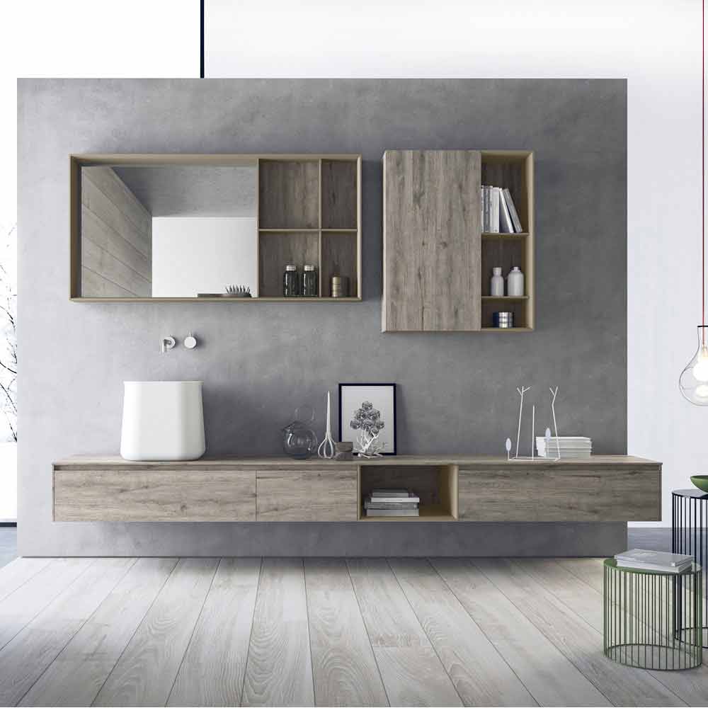 The peculiarity of this composition is given by the silhouette of the tall countertop washbasin , which is distinguished by the edge that opens outwards recalling the shape of a tulip, as opposed to the linearity of the underlying compartments, mitigating the shapes.