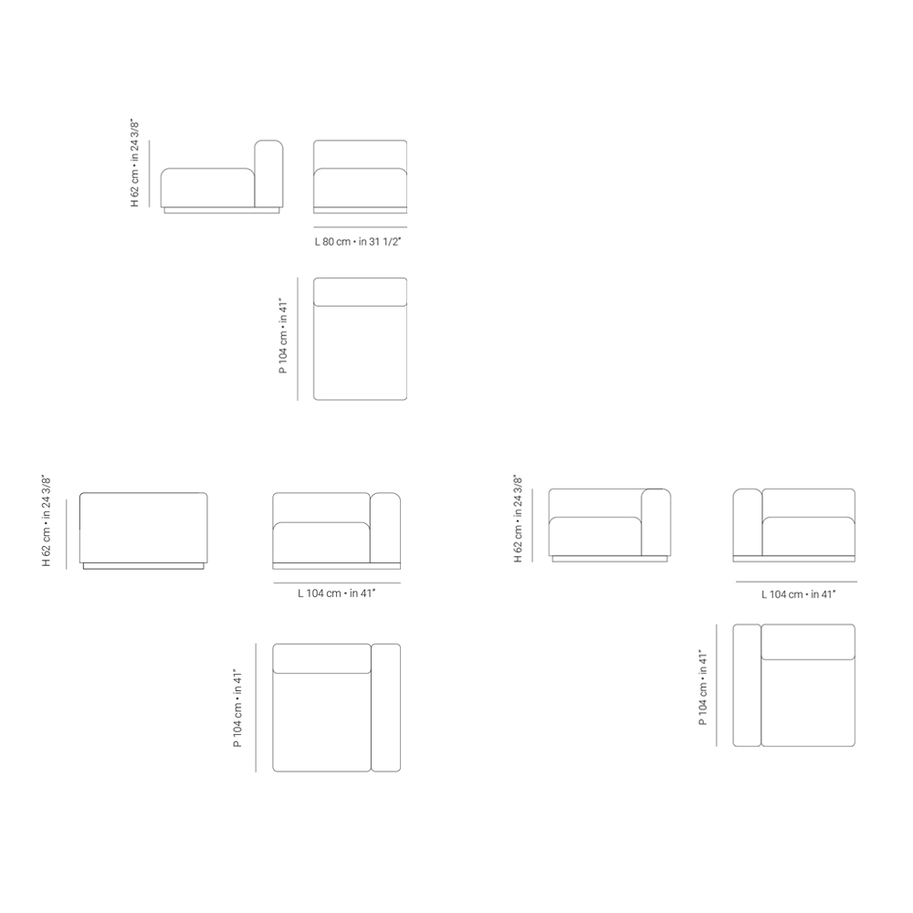Sofa total size: Element dimensions:- right corner element: L 104 x D 104 x H 62 cm
