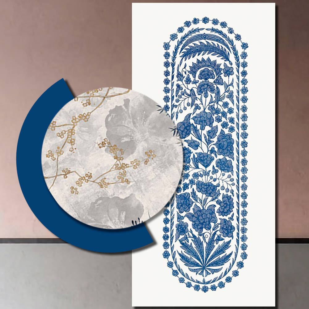 print of branches, leaves and flowers and crescent detail