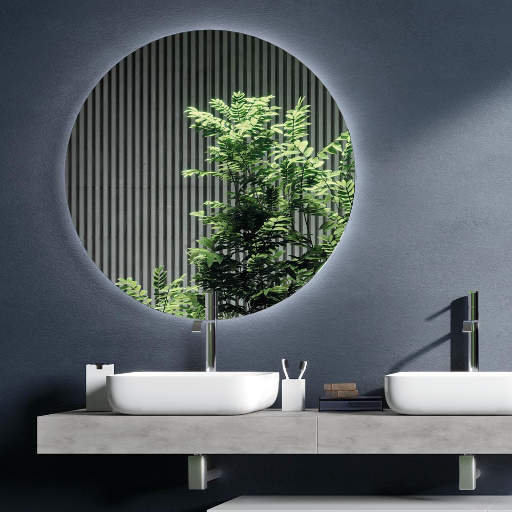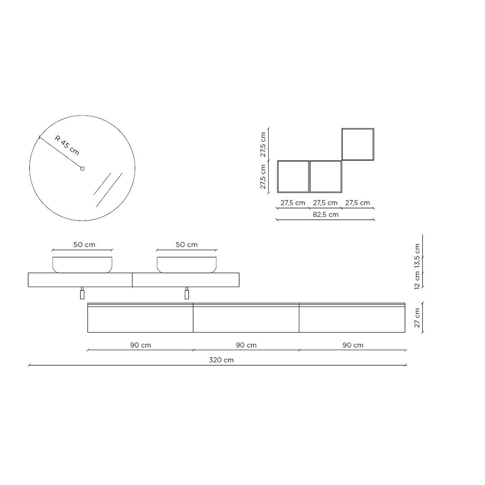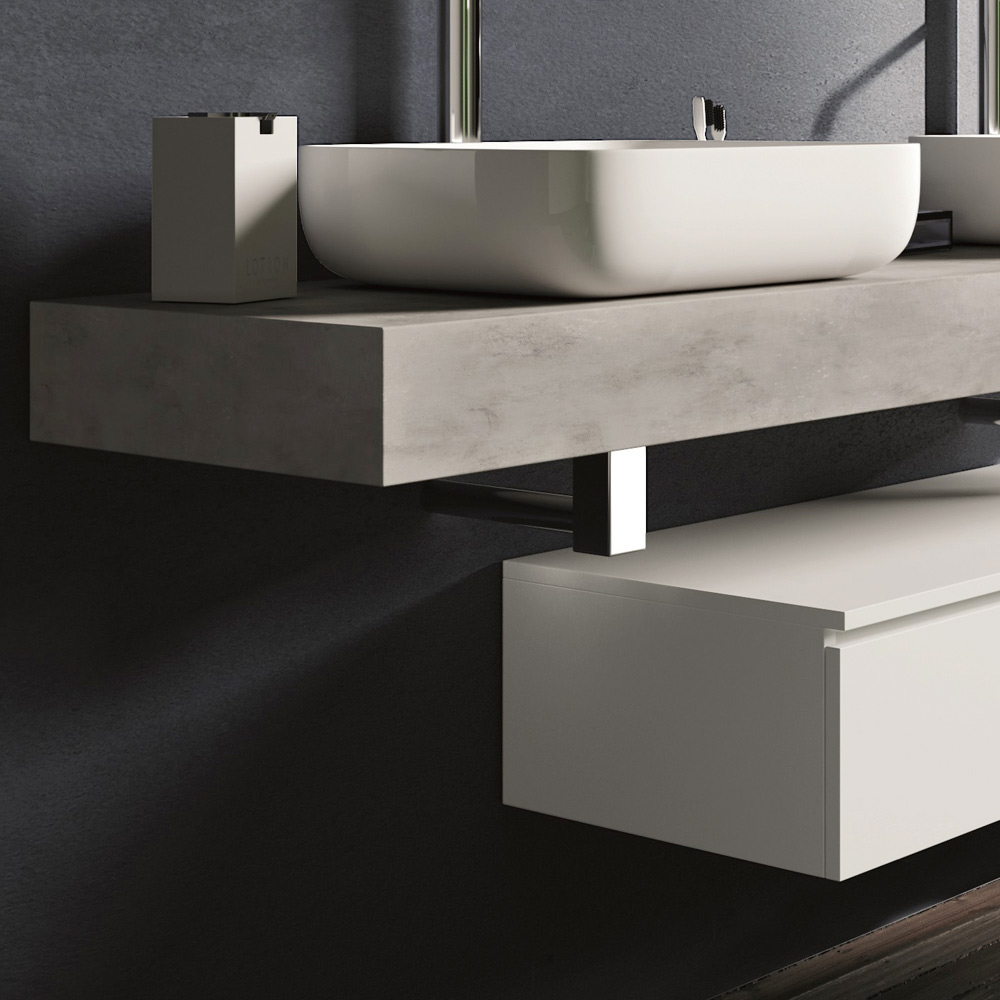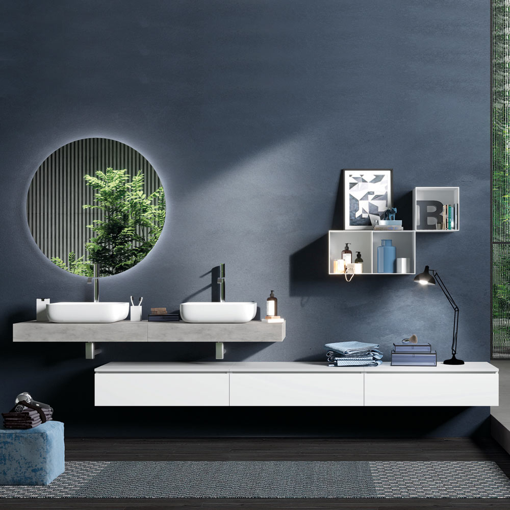 Bathroom composition composed of: 2 glossy white ceramic washbasins resting on two tops in coated MDF and cement-coloured HPL , a base in glossy white scratch-resistant melamine and a round mirror with perimeter LED.