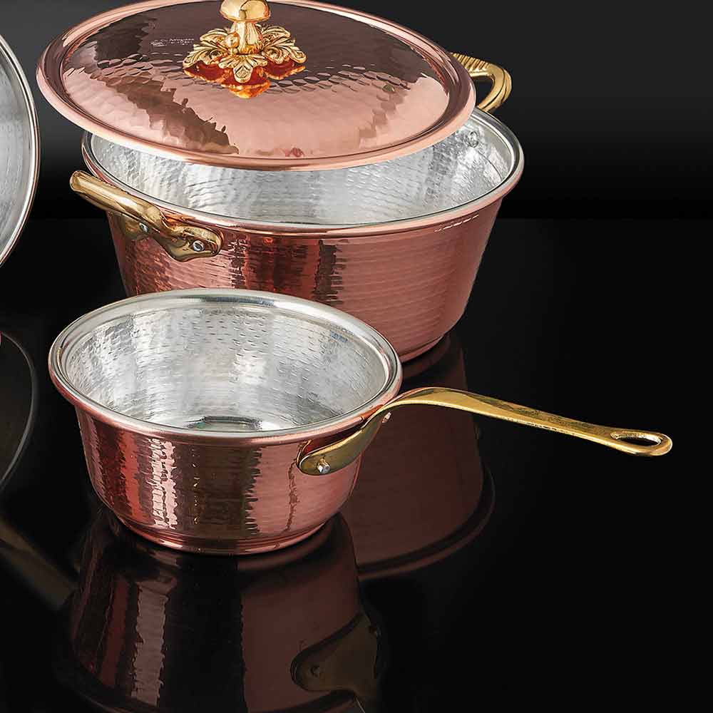 materials of excellent quality. So the copper used is pure copper, with the right physical qualities for perfect modeling. The brass for the handles comes from individual first choice ingots for artisanal casting and the tin used is 100% pure virgin suitable for food use, in compliance with the regulations and with a certificate of analysis.