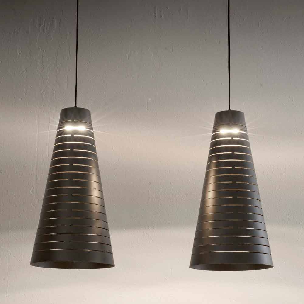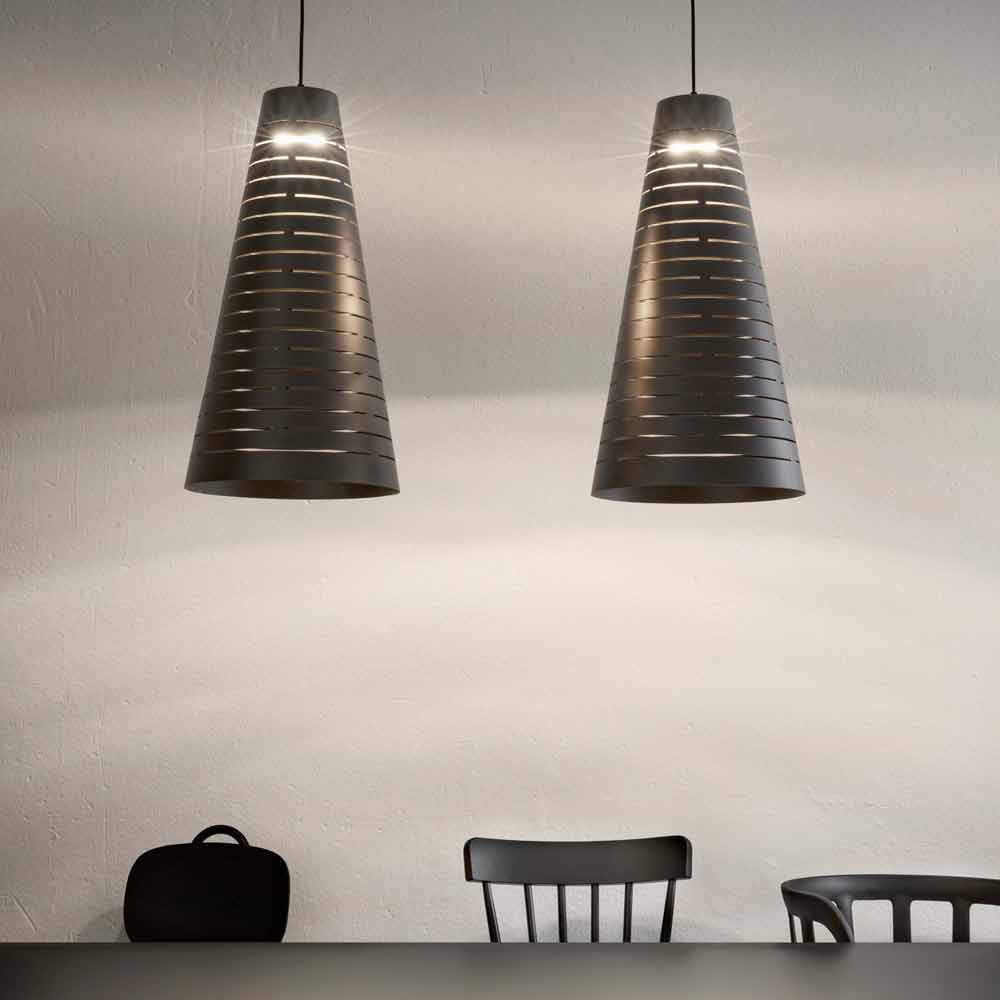 Cervino is a modern style enameled steel lamp with an industrial appeal. The particular horizontal slits on the structure allow to recreate a pleasant network of lights and shadows, able to give an intimate and welcoming atmosphere.