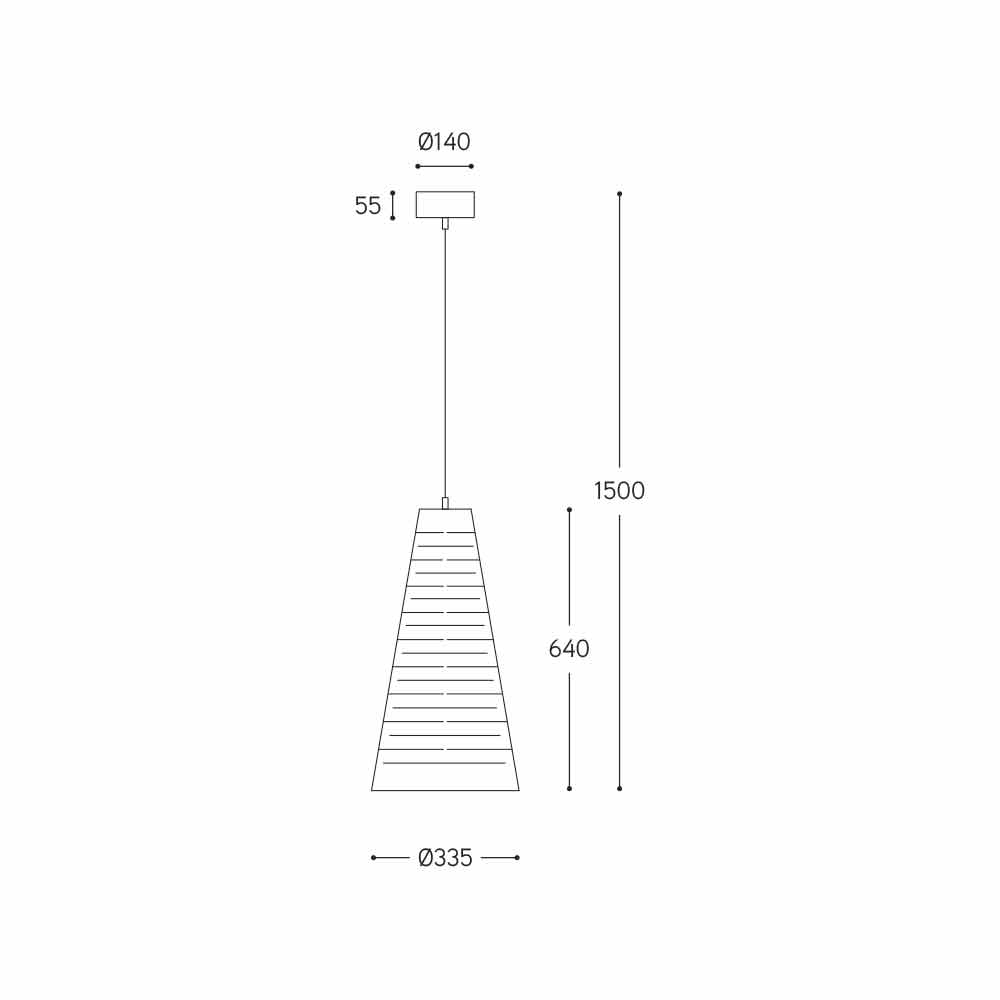 Lamp measures Diameter 335 x H 640 mm; H total with cable and rosette 1500 mm