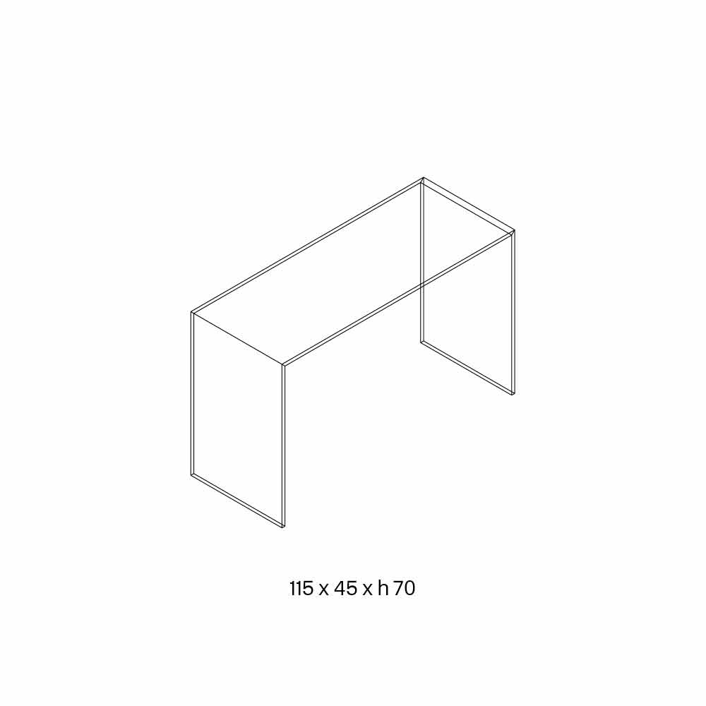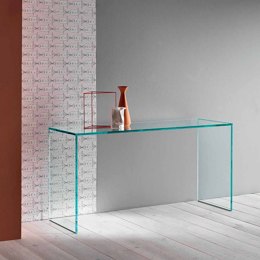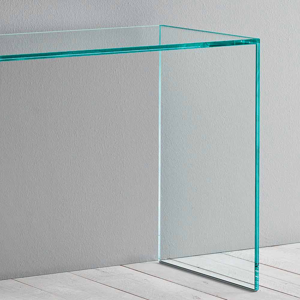 The console is a piece of furniture that can be used transversally in various contexts and has a simple and linear bridge structure, entirely made of extra-clear glass.