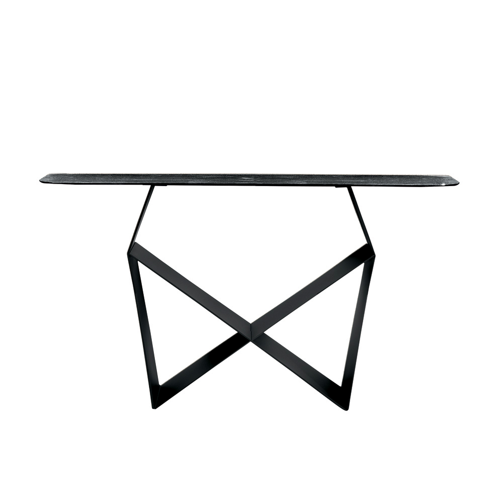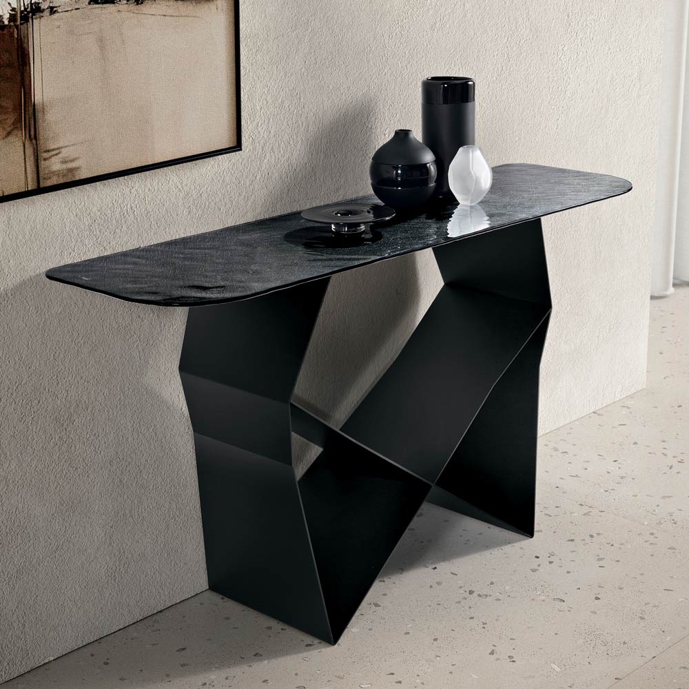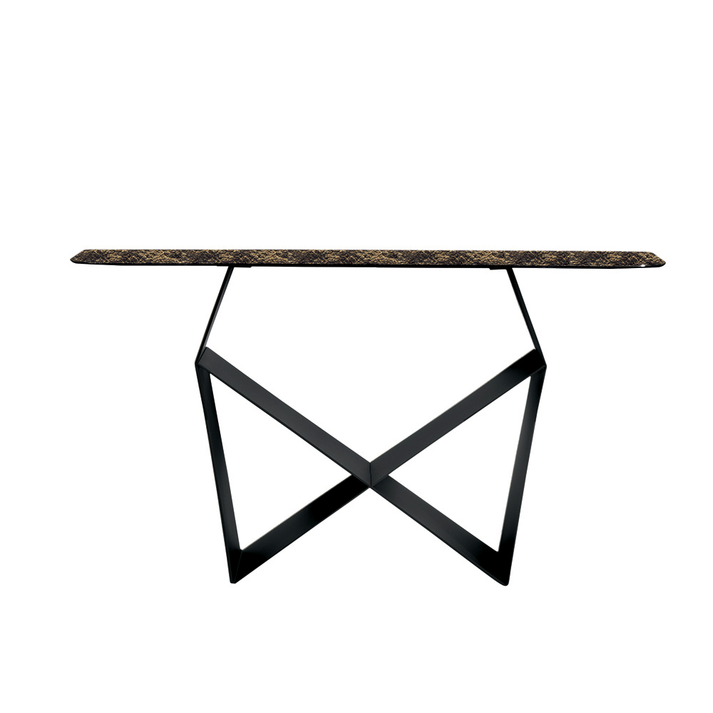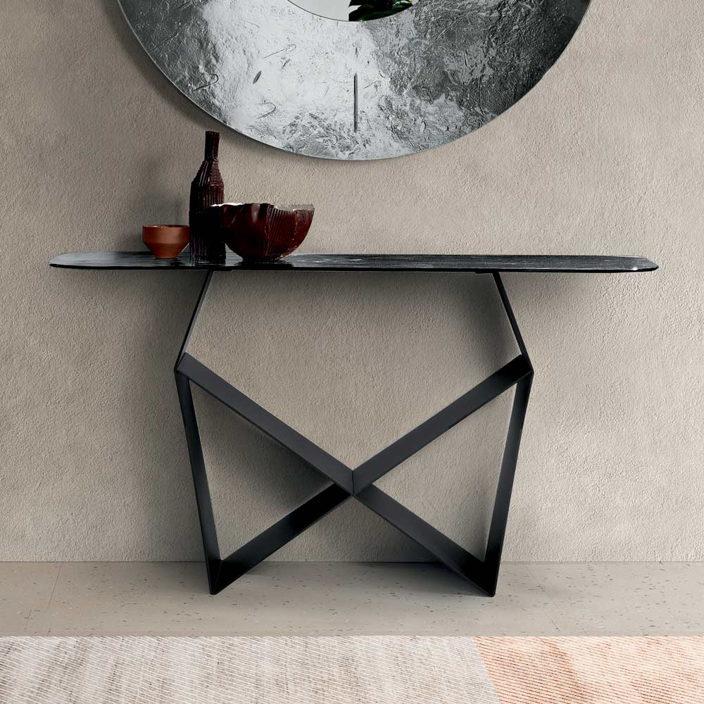 The structure stands out for its painted metal base that creates an original bow-tie shape , creating a refined interplay of solids and voids. This detail lends dynamism and momentum to the composition, giving the console a dramatic yet balanced presence.