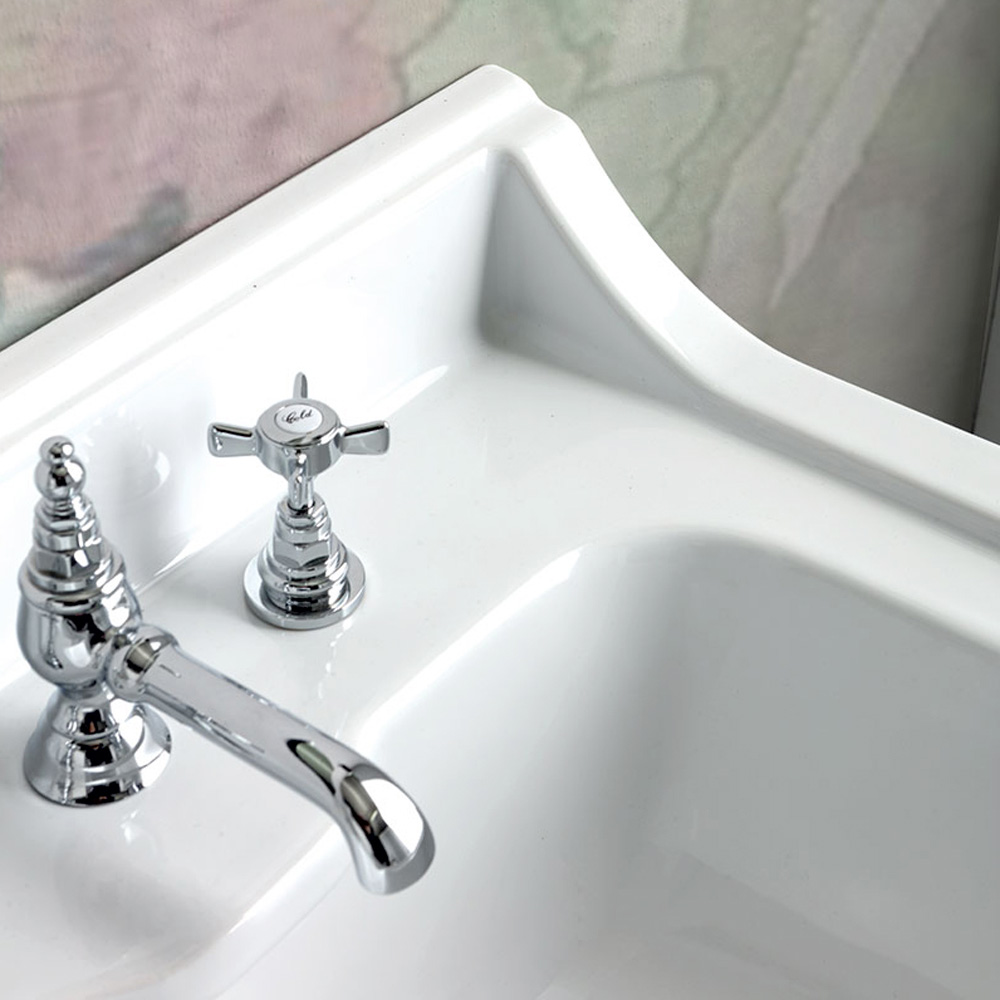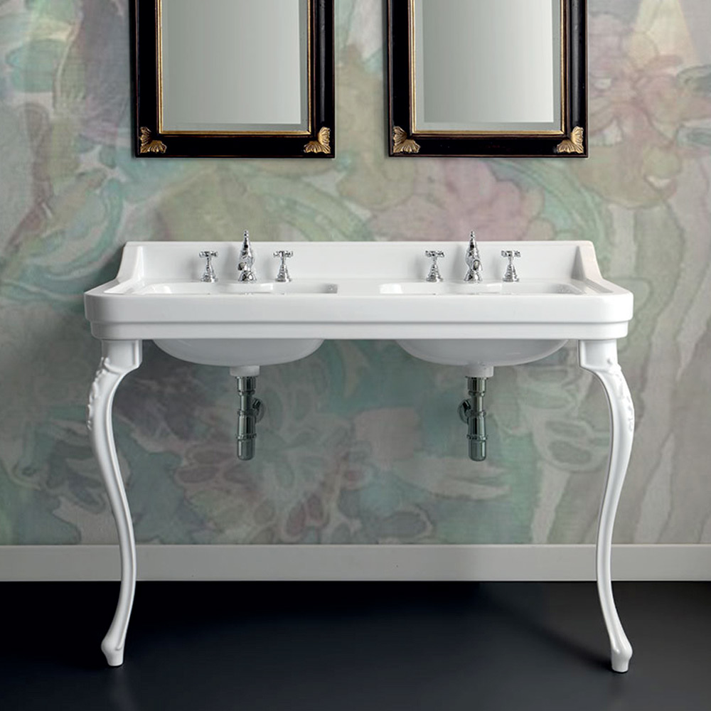Console washbasin with double basin in glossy white ceramic made through a 100% Made in Italy artisanal production . Classic and simple shapes outline the delicate figure of a piece of furniture designed to enrich the bathroom area through a careful search for elements with a strong refined personality . Its aesthetic brings to mind a style of the past that fits perfectly both with classic spaces in which it creates a wonderful harmony of styles and in environments with modern furnishings within which it builds an unusual contrast for a creative and original .