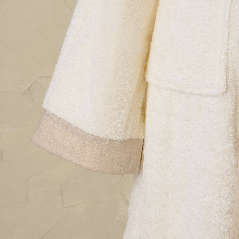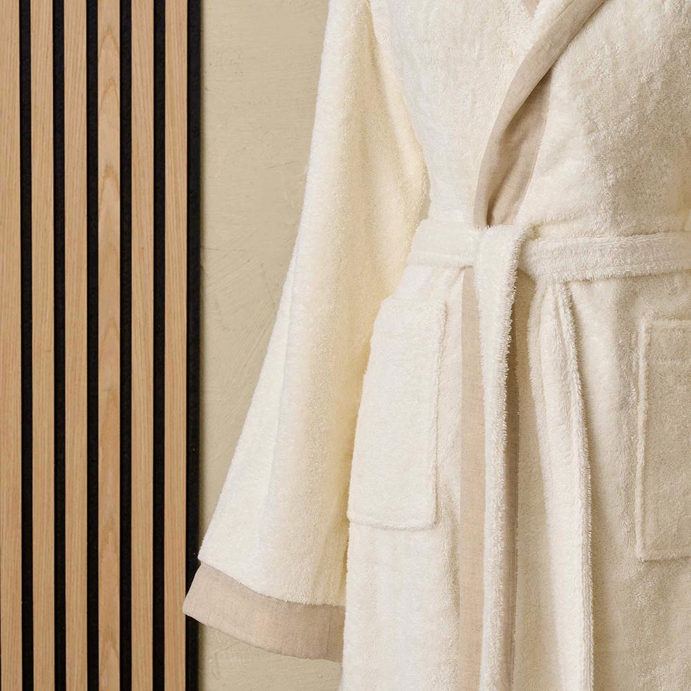 This pure cotton terry hooded bathrobe is the epitome of comfort and sophistication. Elegant and versatile ivory color, this bathrobe is perfect for those looking for a cozy and chic garment to wear after the bath or during moments of relaxation at home.