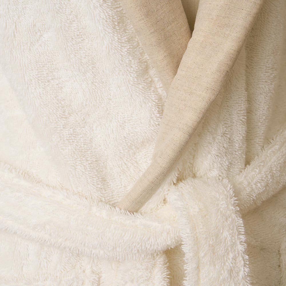 The detail that makes this bathrobe truly special is the pure linen flounce , which not only adds a subtle decorative element but also a contrast of texture that emphasizes the craftsmanship and high quality of the product. The combination of cotton and linen not only guarantees durability and resistance, but also exceptional comfort, with superior absorbency that leaves you dry and wrapped in pure sweetness.