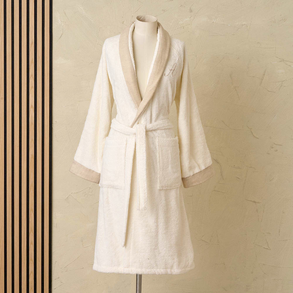 Shawl collar bathrobe in soft pure cotton terry with pure linen flounce and monogram