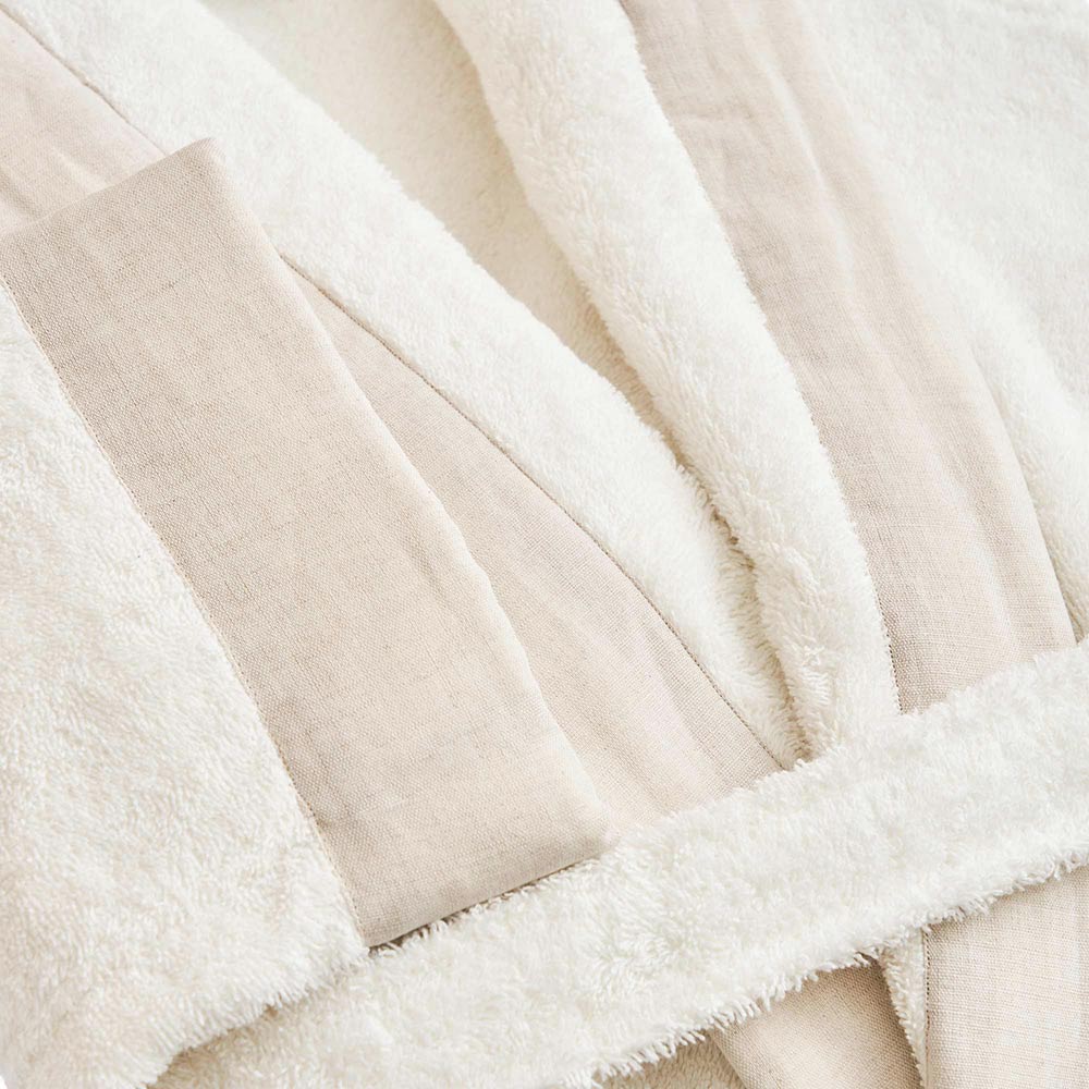 pure linen flounce adorns the hem, enriching the design with a touch of class. Each bathrobe is further personalized with an