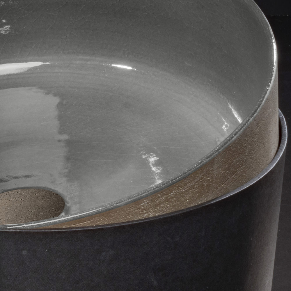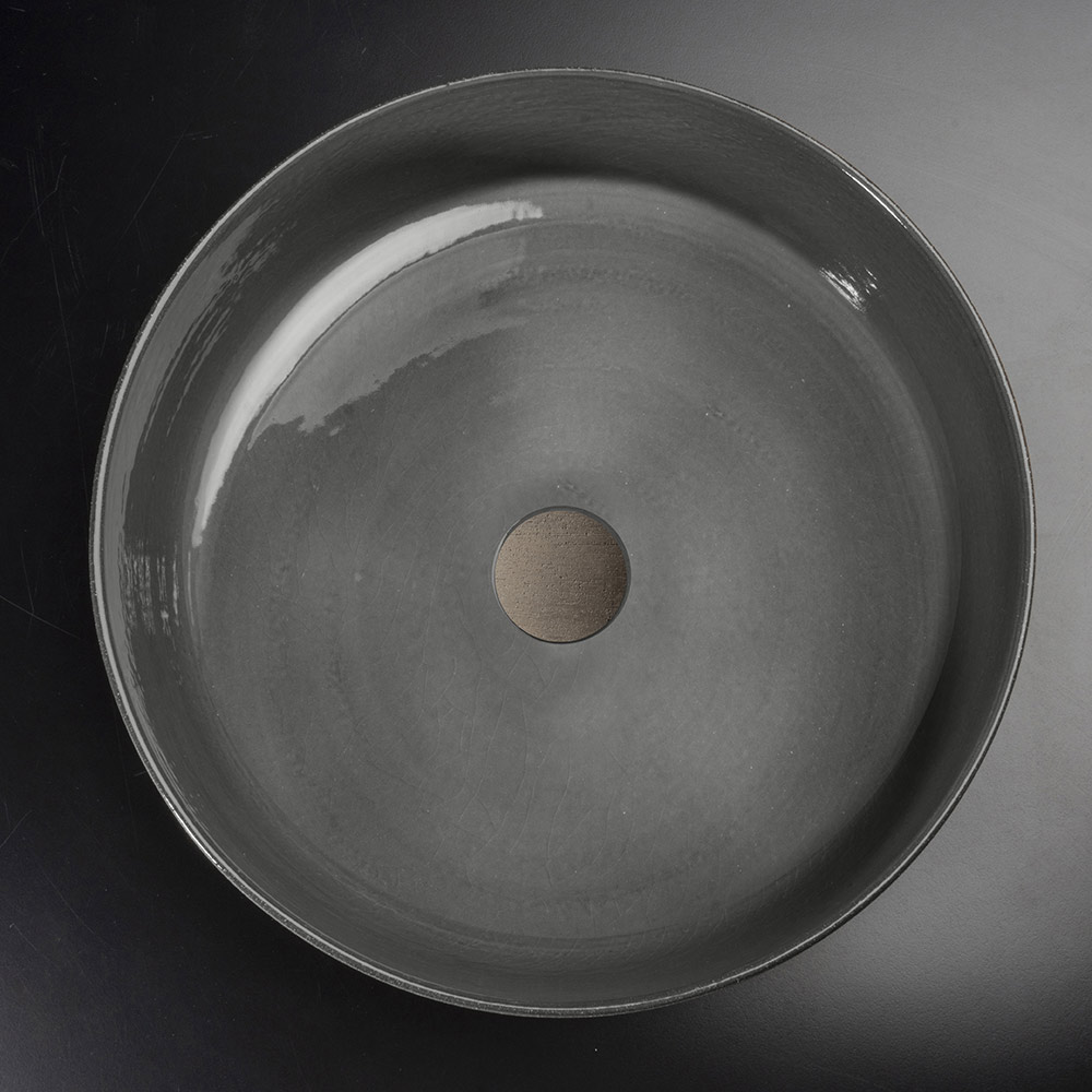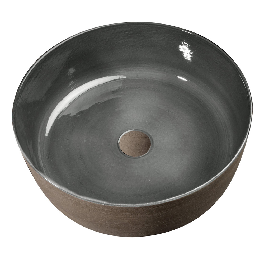 Countertop washbasin with a round shape made in Italy in refractory clay , turned by hand with third fire cooking. Its aesthetic is characterized by the perfect combination of the natural waxed and waterproofed exterior with a more rustic style and the glossy and vitrified gray finish interior, a color that expresses elegance in a discreet and reserved way. Each element of the washbasin is handcrafted to give life to an exclusive furnishing solution, of high value and of unparalleled quality.