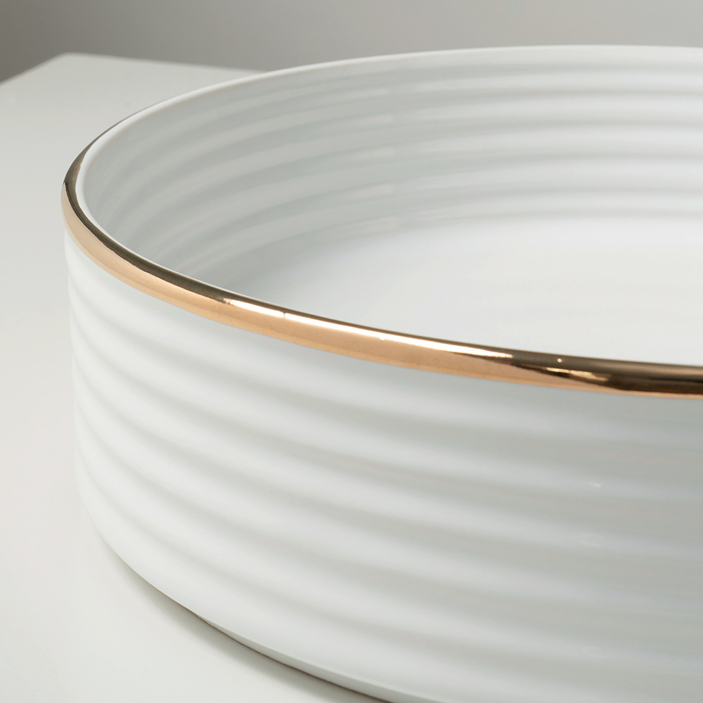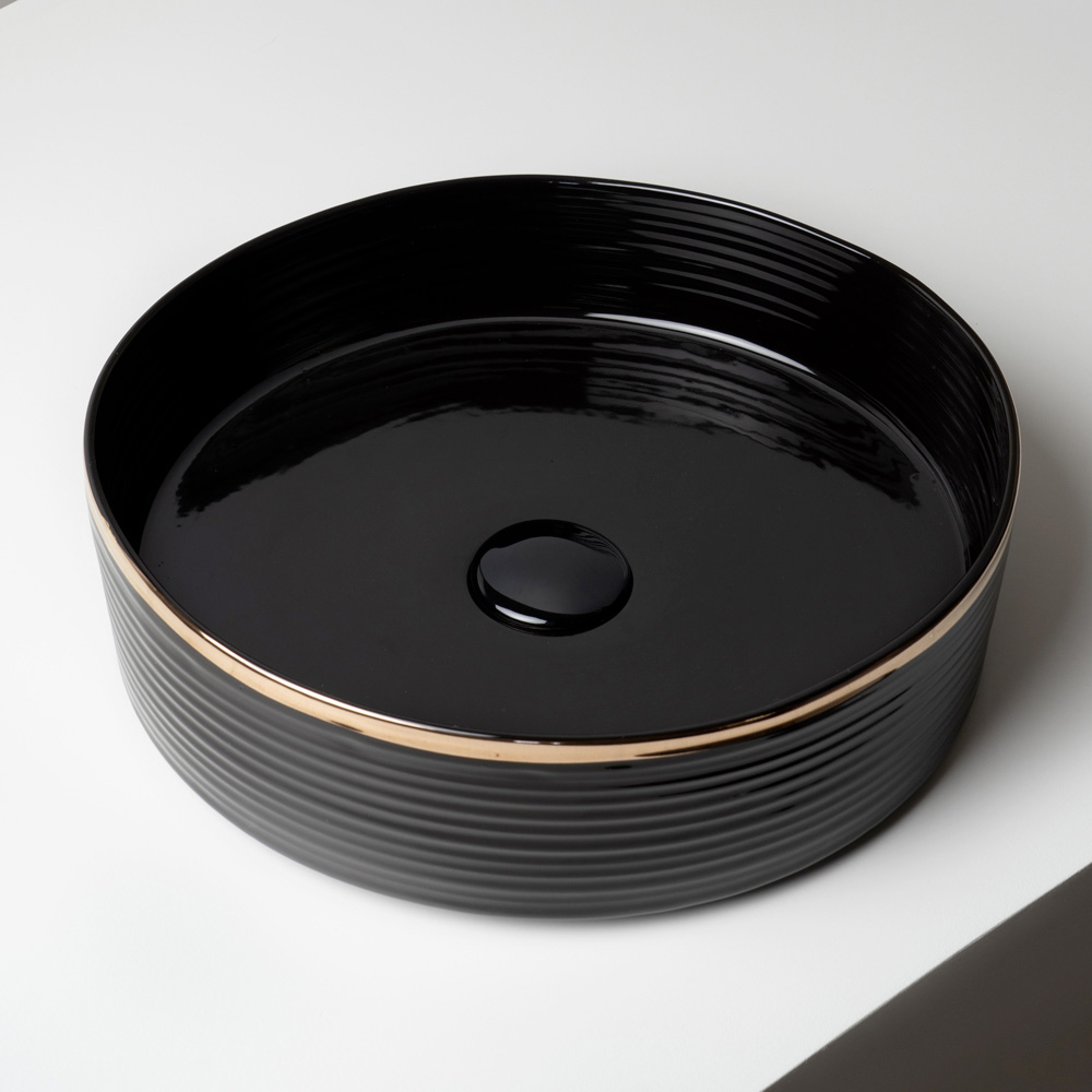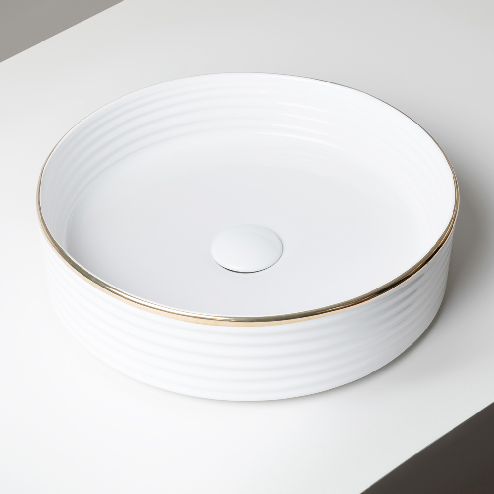 This version features a thin, hand-finished metallic-effect border along the top edge of the sink. This exquisite detail lends elegance and personality, making this sink a true jewel in the bathroom.