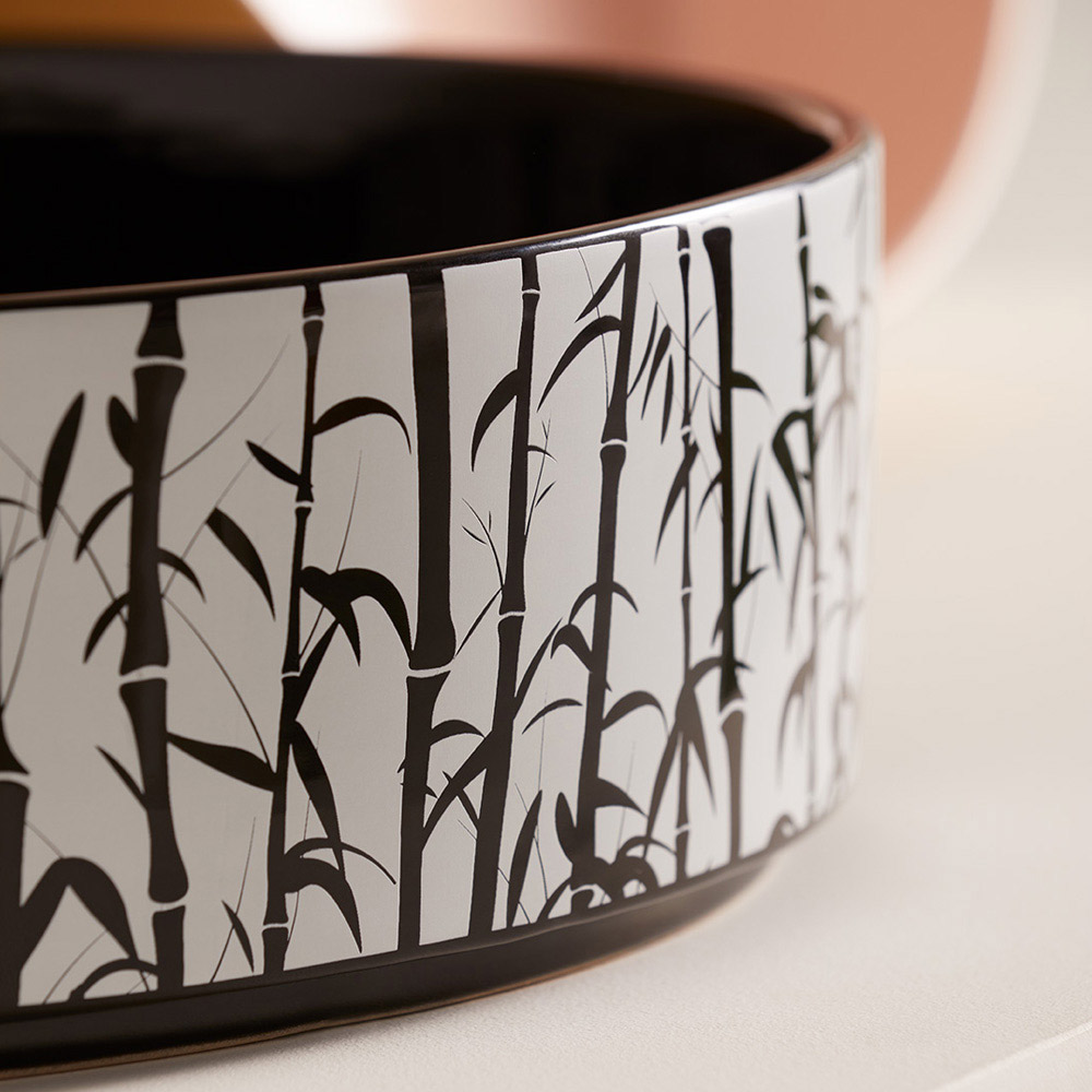 • glossy black interior, exterior white negative relief decoration on matt black enamel (black bamboo)