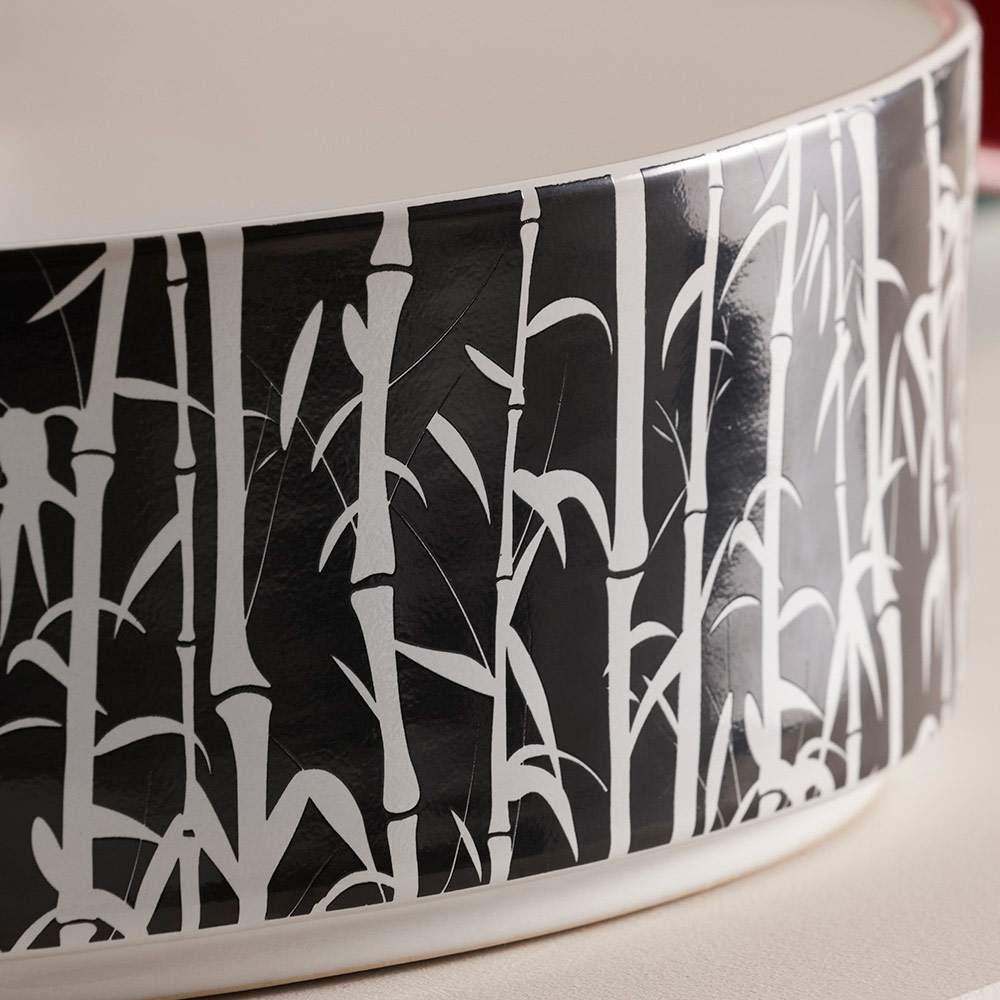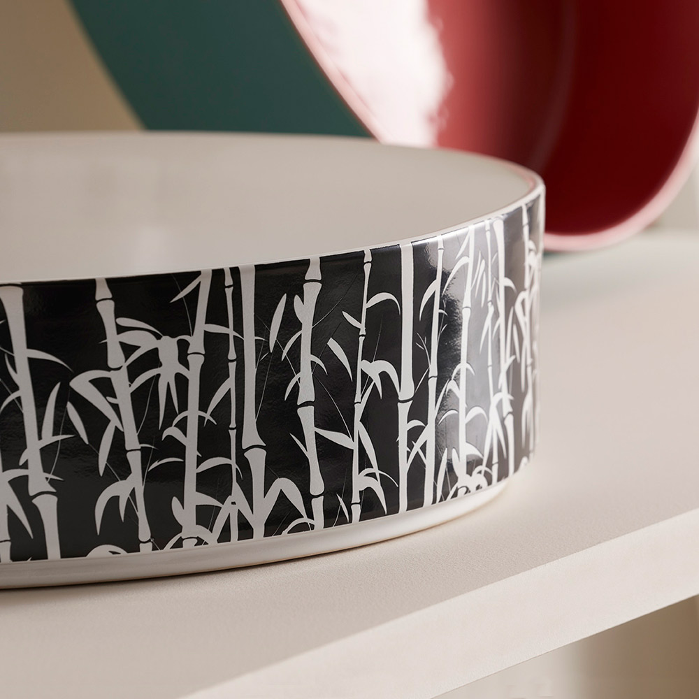 • glossy white interior, exterior black negative relief decoration on matt white enamel (white bamboo)