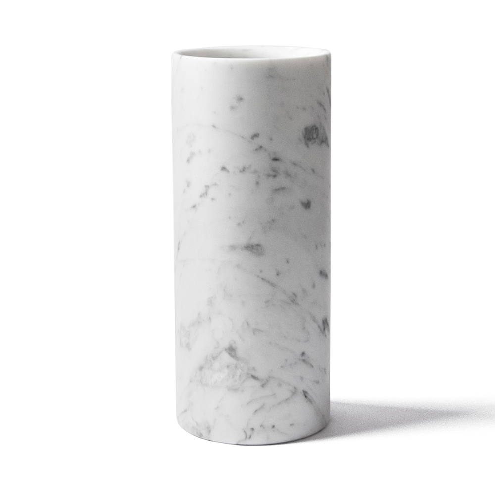 This cylindrical shaped decorative vase is an object of daily use in finely worked satin white Carrara marble able to give singularity to the space through the design and strong decorative elements.