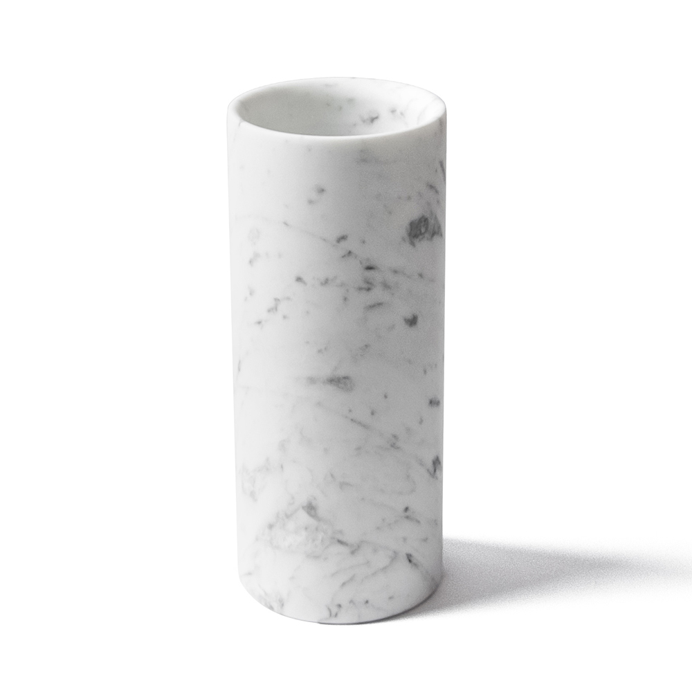Handcrafted vase in white Carrara marble cylindrical design made in Italy.