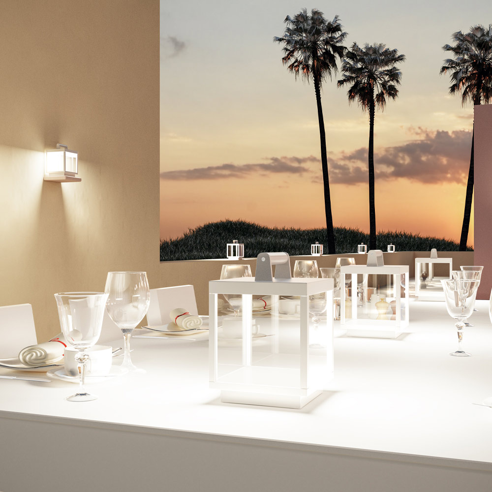 Thanks to its conformation it is perfect both as a support lamp in combination with several elements, and as a suspension lamp through the use of the hook positioned in the upper part. The result is a high quality complement capable of highlighting outdoor areas within domestic or contract environments.